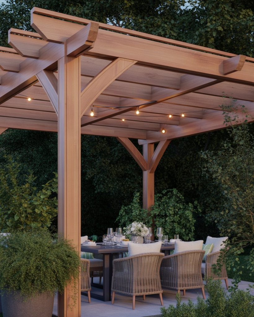 A covered pergola with a full roof is ideal for those who want comfort in rain or heavy sun. It blends the feel of a pavilion with the open look of a pergola, making it practical for dining areas or grilling stations. Many homeowners appreciate how it expands the usable season, a trend strongly mentioned by outdoor experts on House Beautiful. It’s a smart upgrade for homes in warmer climates.