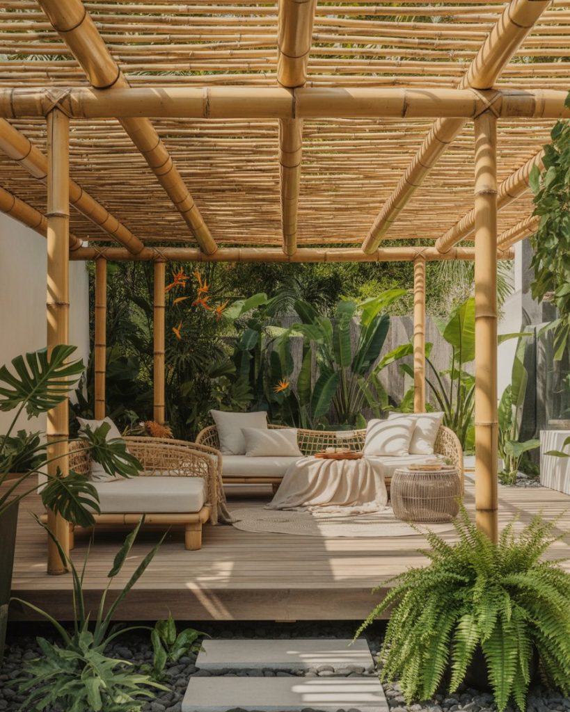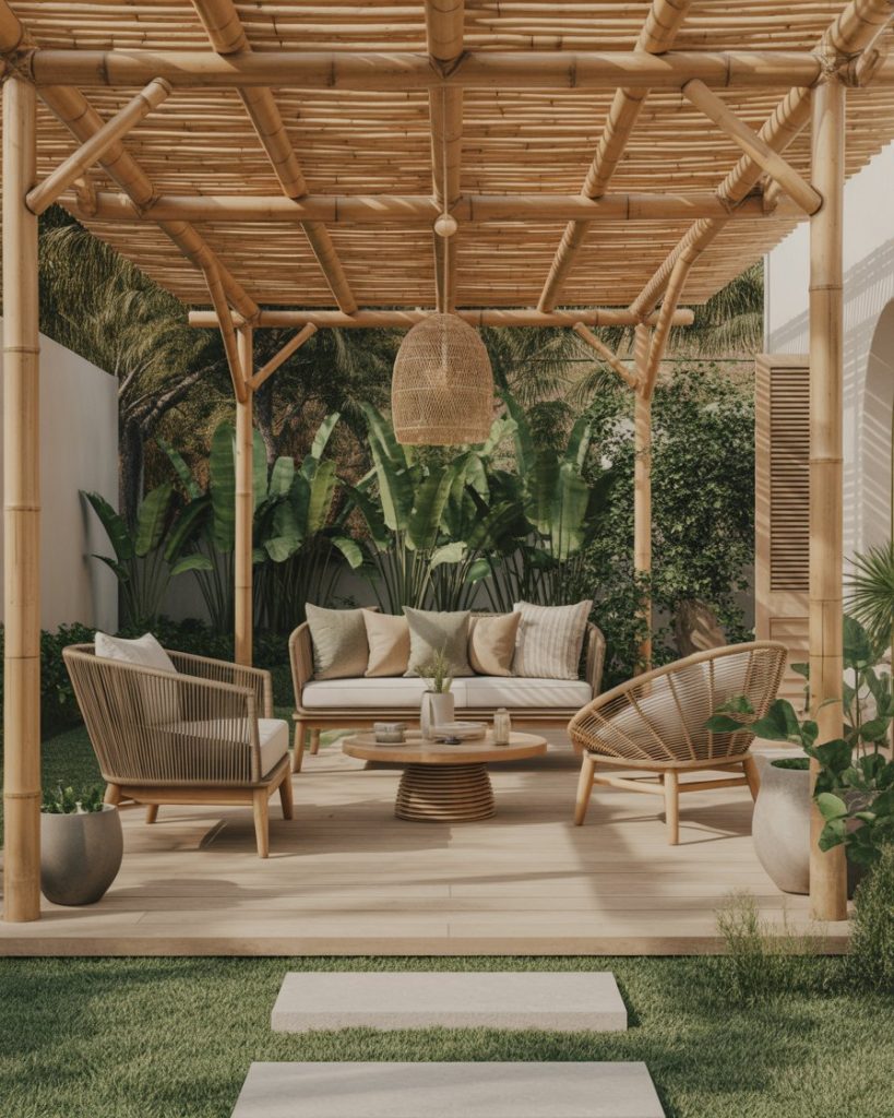 A bamboo pergola adds a breezy, resort-like atmosphere to a garden or poolside corner. Homeowners choose it for its lightweight structure and relaxed tone, making it ideal for lounges or reading spots. Designers often recommend this style when clients want a natural but airy material. It works especially well in backyard layouts that feel too rigid or modern, softening the space instantly.
