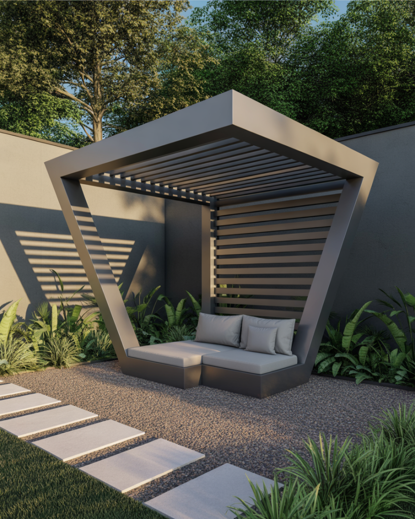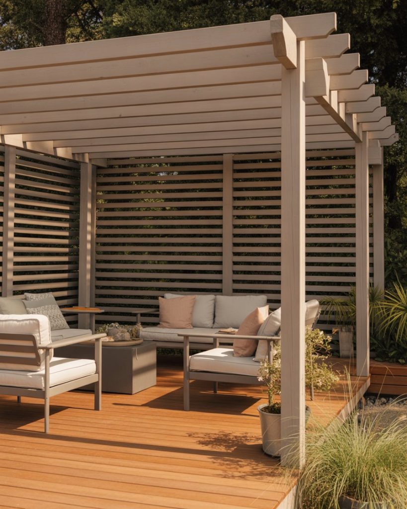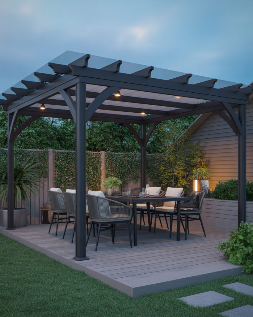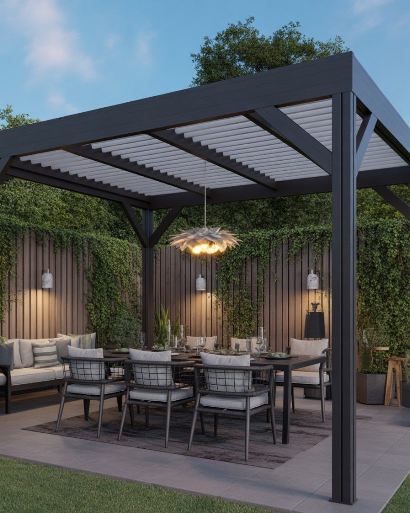 A sleek steel pergola with adjustable slats offers precise shade control—perfect for sunny outdoor areas. This structure looks sophisticated and pairs nicely with concrete pavers or a composite deck. Many design influencers say slatted roofs are trending because they adapt to weather easily. It’s a smart upgrade when you want modern function without overbuilding.