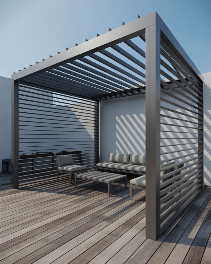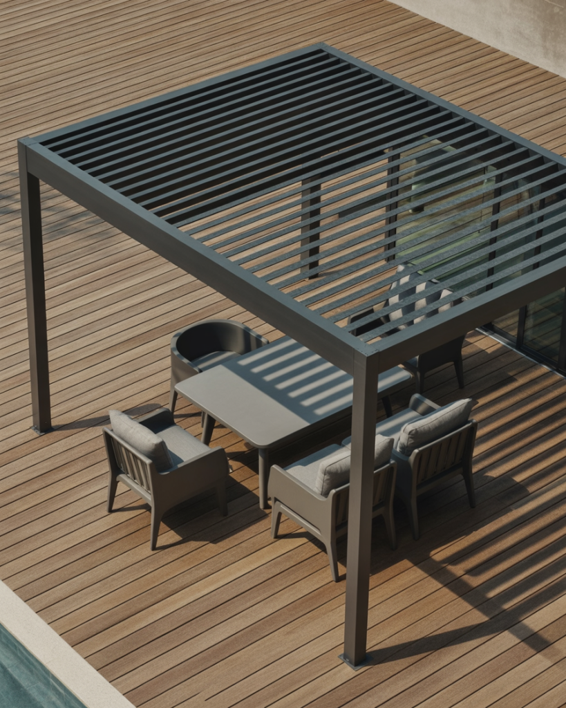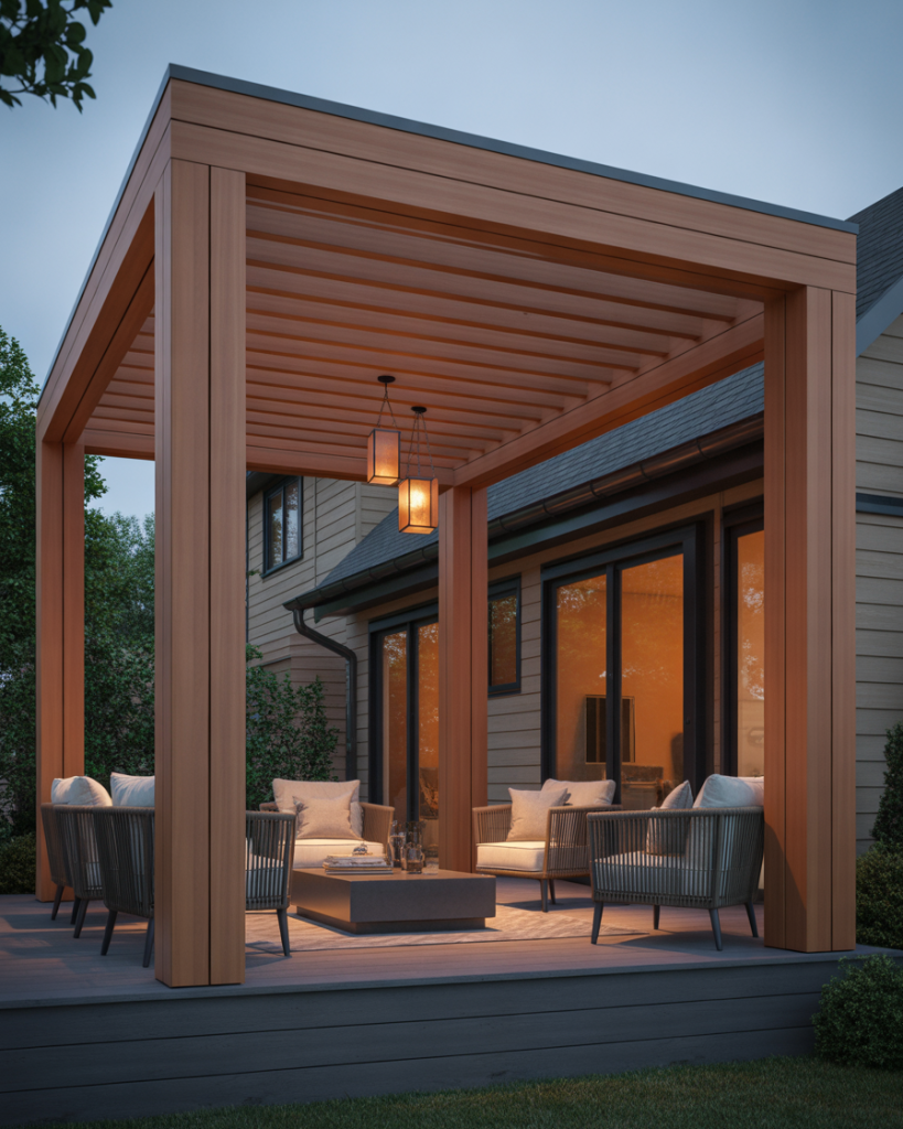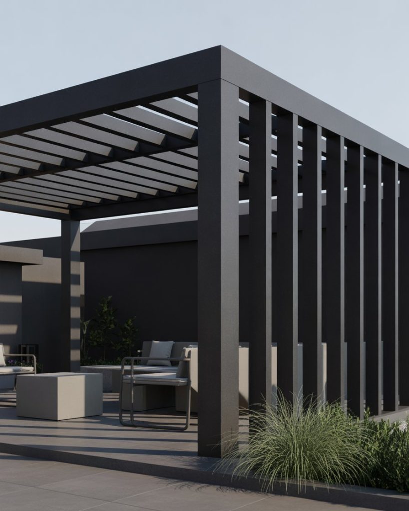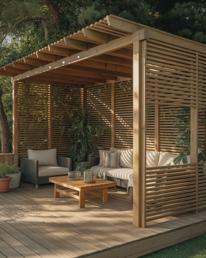 A sleek steel pergola with adjustable slats offers precise shade control—perfect for sunny outdoor areas. This structure looks sophisticated and pairs nicely with concrete pavers or a composite deck. Many design influencers say slatted roofs are trending because they adapt to weather easily. It’s a smart upgrade when you want modern function without overbuilding.