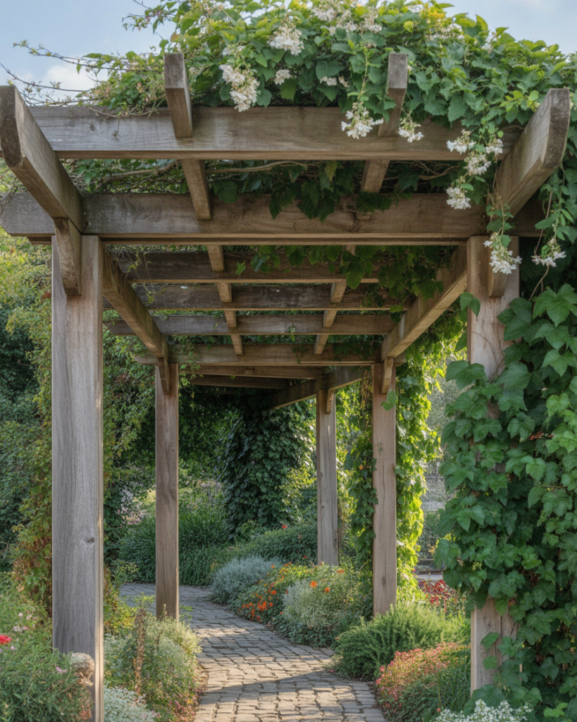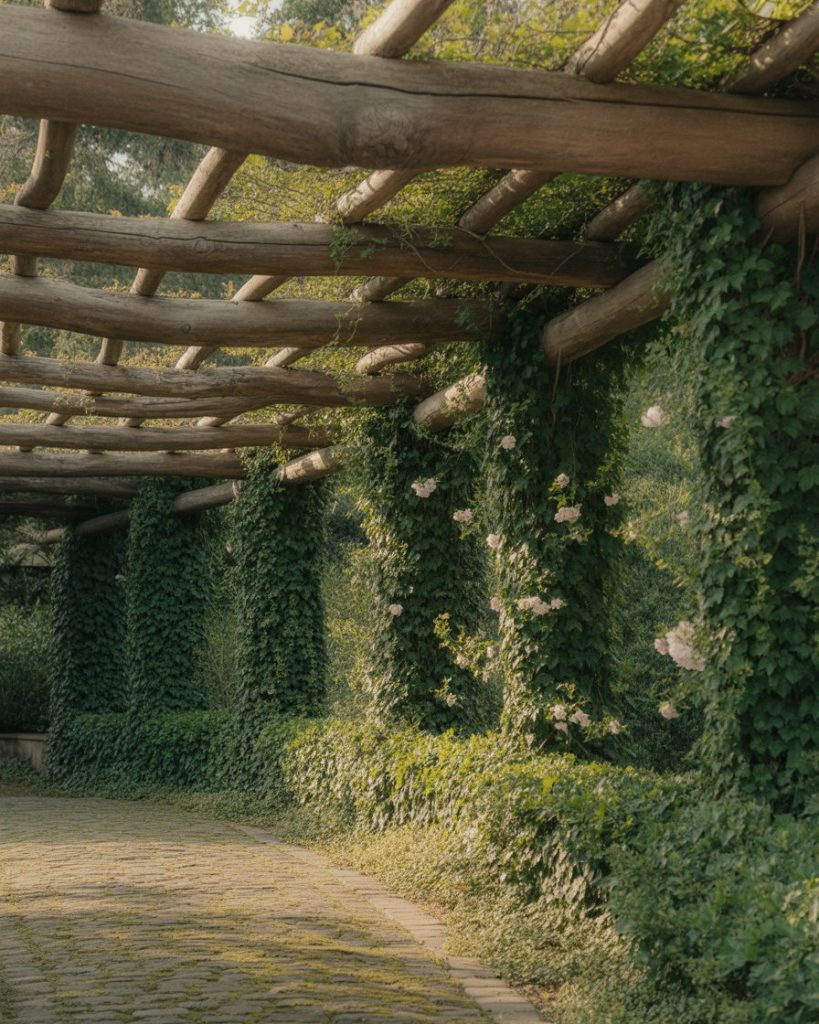 A rustic pergola placed in the garden becomes magical once climbing vines or roses grow across the top. Homeowners who love cottage-inspired spaces enjoy how it softens hard edges and adds charm throughout the seasons. It’s common in older neighborhoods where landscapes already feel established. The look improves every year as plants mature.