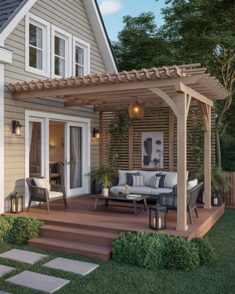A pergola attached over a back porch is ideal for creating a unified indoor-outdoor zone. Homeowners use it to shade seating areas, add definition, and improve curb appeal. This idea suits both small and large homes, especially when you want structure without building a full roof addition. It blends seamlessly with siding and helps visually anchor the entrance to the backyard.