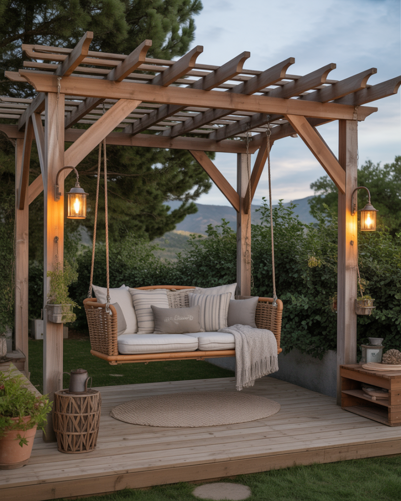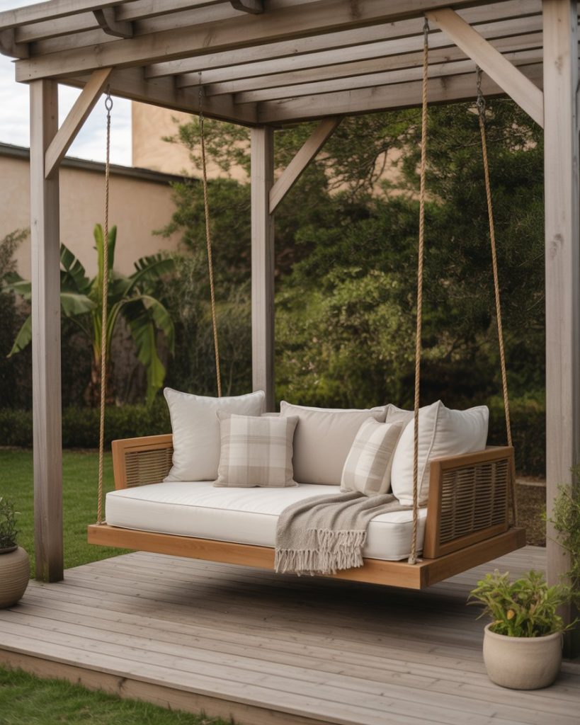 Adding a large swing or daybed under a pergola transforms a simple outdoor corner into a retreat. This setup works beautifully for reading, napping, or lounging during warm afternoons. Influencers often highlight it because it adds comfort without major renovations. It also suits both patio and deck layouts, making it a flexible upgrade.