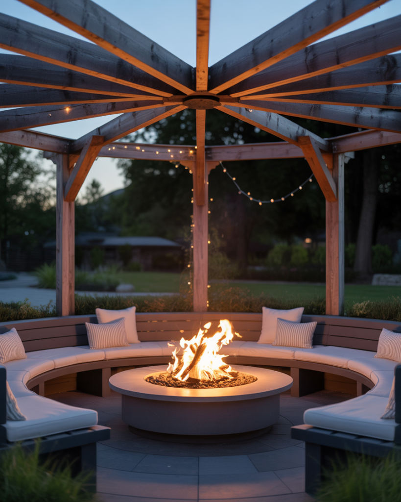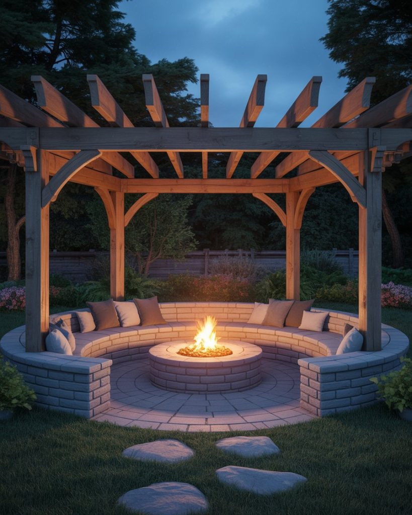 A pergola surrounding a fire pit creates an intimate backyard gathering space. Homeowners love the warm glow and structure, especially during cooler evenings. This setup pairs well with gravel bases, wooden beams, or even steel posts. It also helps define the seating circle, making conversations feel more intentional and comfortable.