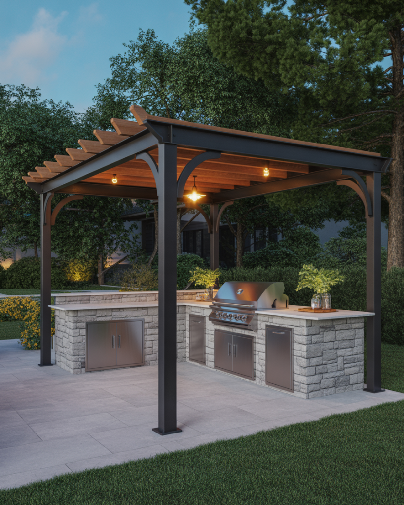 A pergola placed over an outdoor kitchen defines the zone and protects cooking equipment from harsh sun. Homeowners love pairing stainless appliances with wooden or steel framing. It’s a favorite trend among grilling enthusiasts who want a stylish cooking hub. This idea also works well with stone countertops and built-in seating.