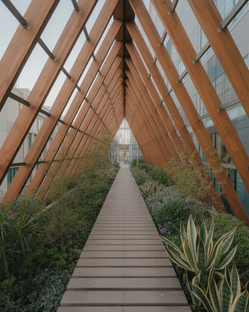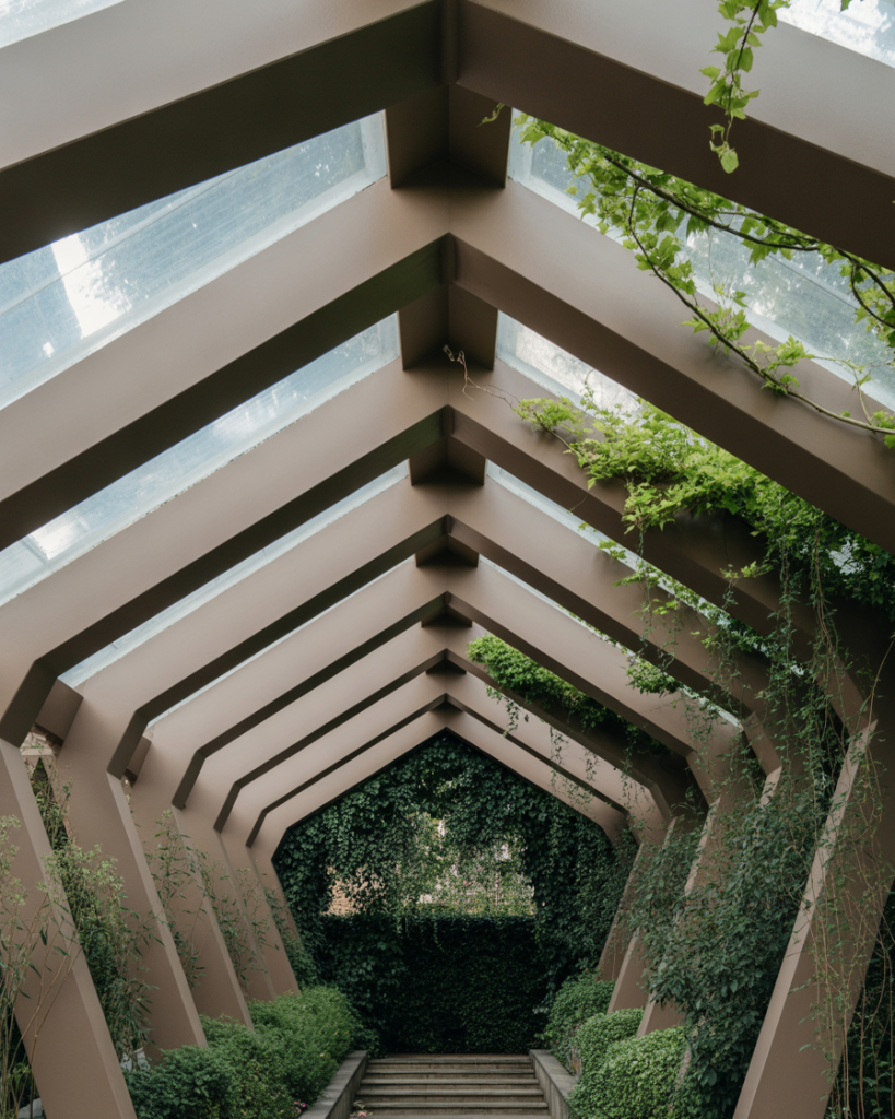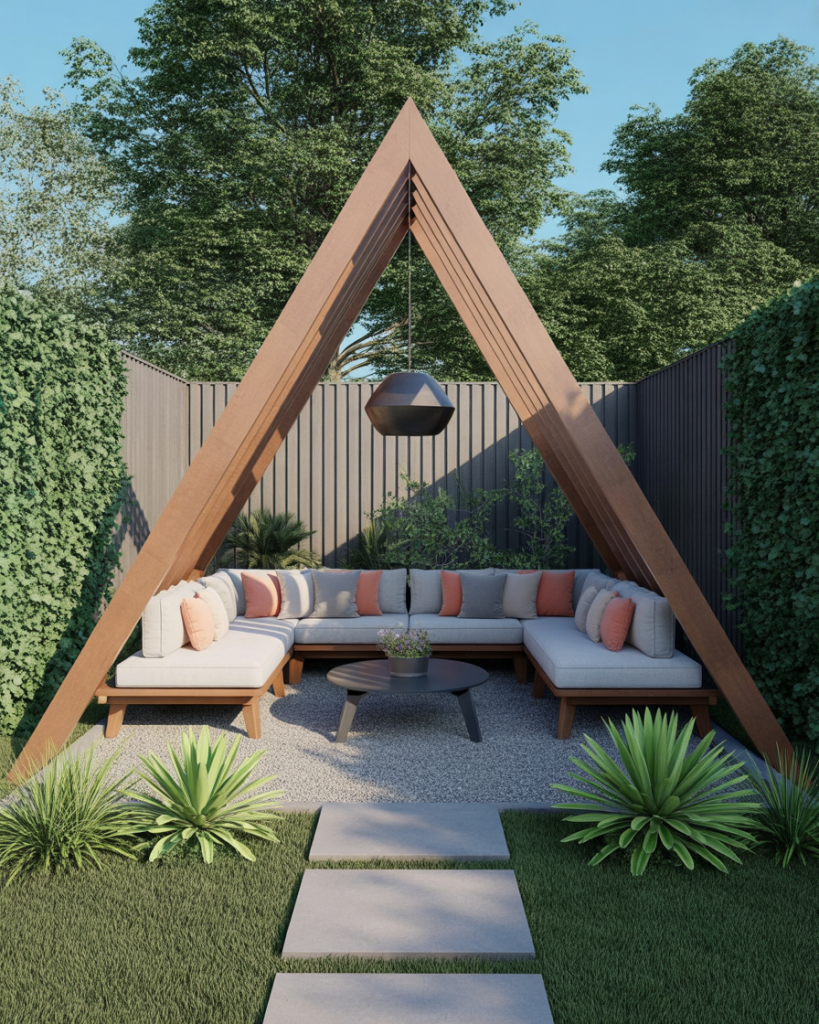 A triangle pergola stretched across a garden walkway adds interest to long or narrow side yards. It creates a sculptural moment that breaks up monotony and adds shade for plants below. Garden designers often choose this when pathways feel too simple or straight. It’s a subtle architectural touch that feels custom and artistic.
