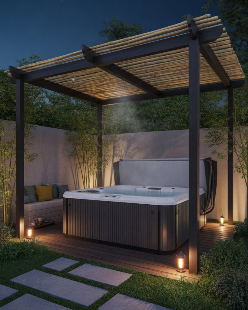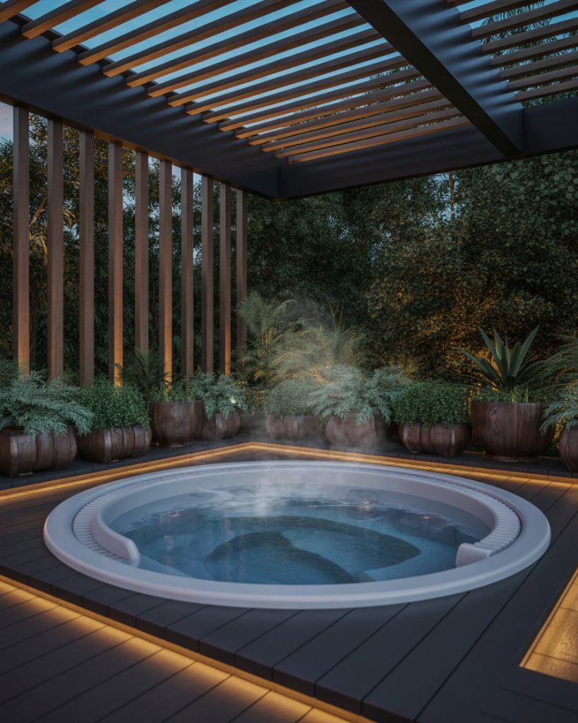 A hot tub with a pergola provides a shaded oasis and privacy. Some people install bamboo slats to create a spa feel, while others add fabric for warmth. This idea is very popular on wellness blogs because it turns any simple patio into a calm and relaxing place, and the structure is great for lighting and decor to create a vacation feel for evening soaks.