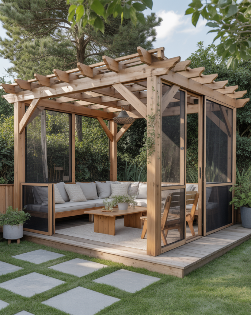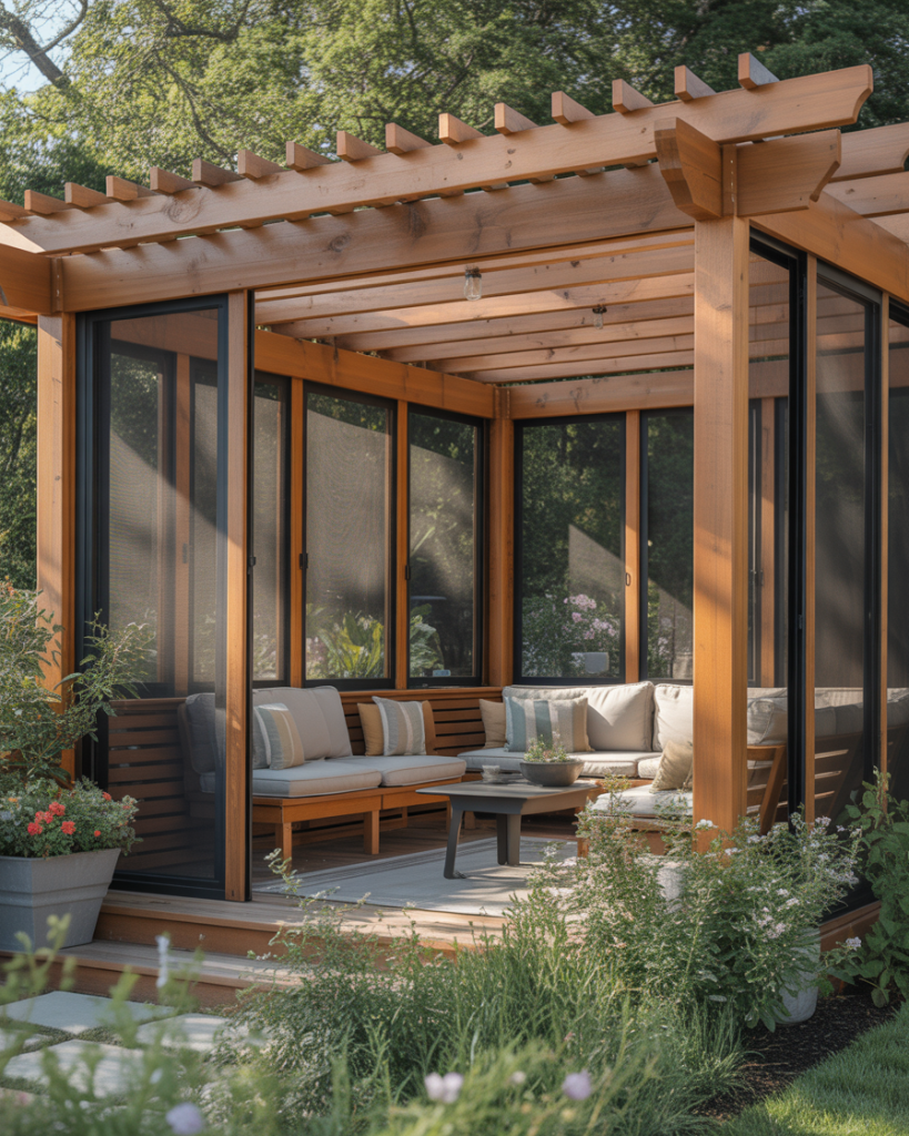 For regions with bugs or wind, an enclosed or screened-in pergola provides structure and protection. Inspired by classic American porches, it allows airflow while keeping the space usable year-round. This design blends well with garden paths and outdoor kitchens, making it a favorite in suburban neighborhoods. I often see families turn it into a hybrid dining–lounge zone.