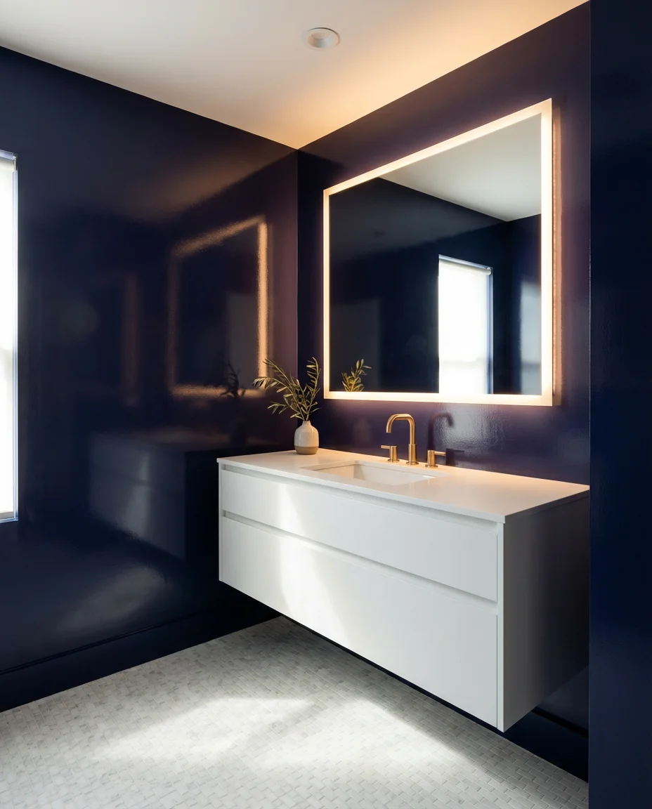 Navy and pink is one of those color pairings that feels both traditional and thoroughly modern at the same time. Deep inky navy on lower walls or cabinetry, paired with a soft pink upper half or ceiling, creates a bathroom with the kind of tonal depth you’d find in a boutique hotel room. The contrast is bold but refined—the navy reads as serious and anchoring, while the pink keeps things from feeling too heavy or masculine. It’s a particularly strong combination in bathrooms with crown molding or other architectural detailing, where the two-tone effect can follow the natural breaks in the room.