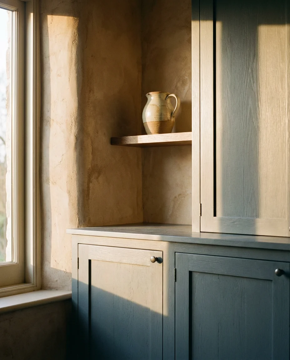 Japandi—the fusion of Japanese minimalism and Scandinavian hygge—seems like an unlikely host for pink, but blush integrates into this aesthetic with remarkable ease. The key is keeping it extremely restrained: a barely-there blush applied to plaster walls, a single pink ceramic object on an otherwise empty shelf, or a faded rose linen pillow among natural and neutral bedding. Everything else adheres to Japandi rules—low furniture, clean lines, natural materials, and deliberate emptiness. The blush adds a single note of warmth to an otherwise coolly serene space.