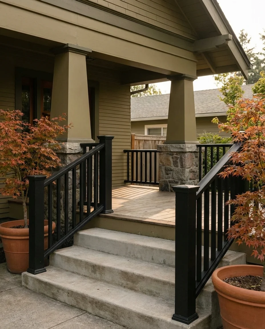 A durable iron railing gives any classic front porch a timeless air of elegance. Particularly suitable on historic homes, urban brownstones, or cottages further adorned with hints of old-world charm. Wrought iron, strong as it is, can be shaped into very intricate patterns or simple ones, almost to the point of plain, adding flexibility. I have always admired how an aged iron railing gains character and remains strong. That makes a worthy investment.