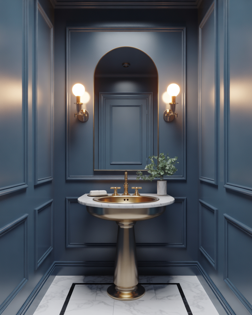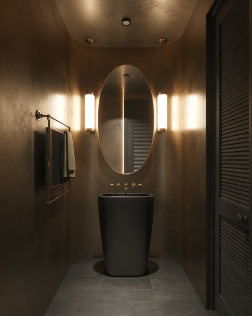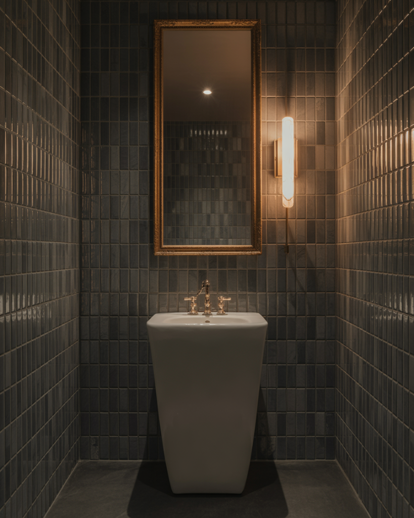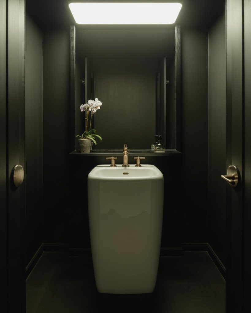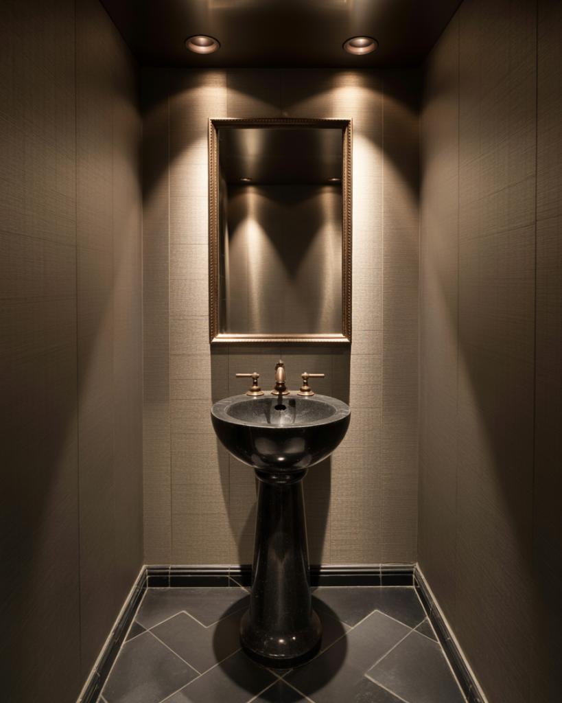 A moody metallic powder room uses shimmer subtly. Deep bronze, gunmetal, or graphite finishes look gorgeous alongside a matte black pedestal sink and muted lighting. The look is elegant modern, sophisticated, and a little mysterious-perfect for evening ambiance.