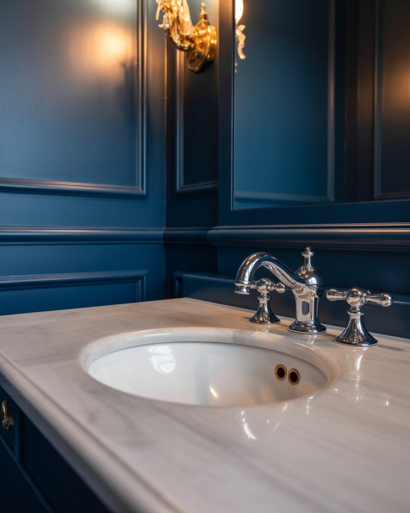 A luxurious blue powder room feels indulgently calming Deep navy walls, with brass fixtures and marble surfaces, are the height of depth and shine. Complement with a sculptural pedestal sink and a large mirror to reflect the light. This sophisticated expression mixes deep richness with soothing calmness, creating a timeless approach that feels both contemporary and traditional.