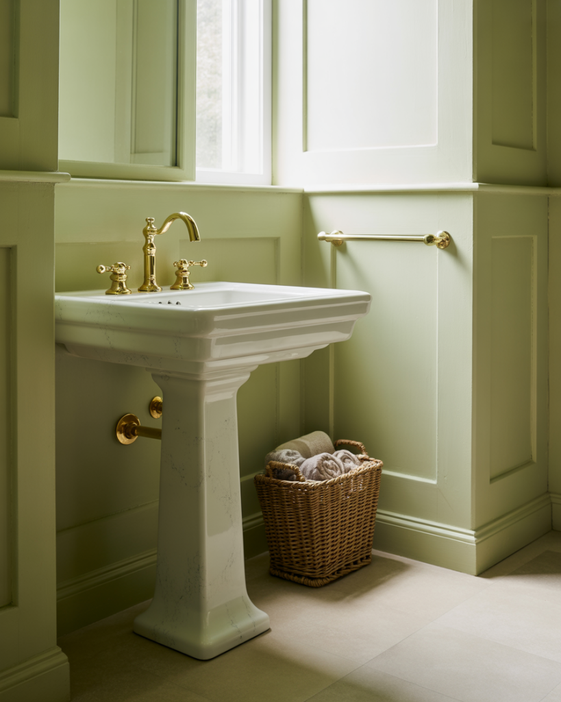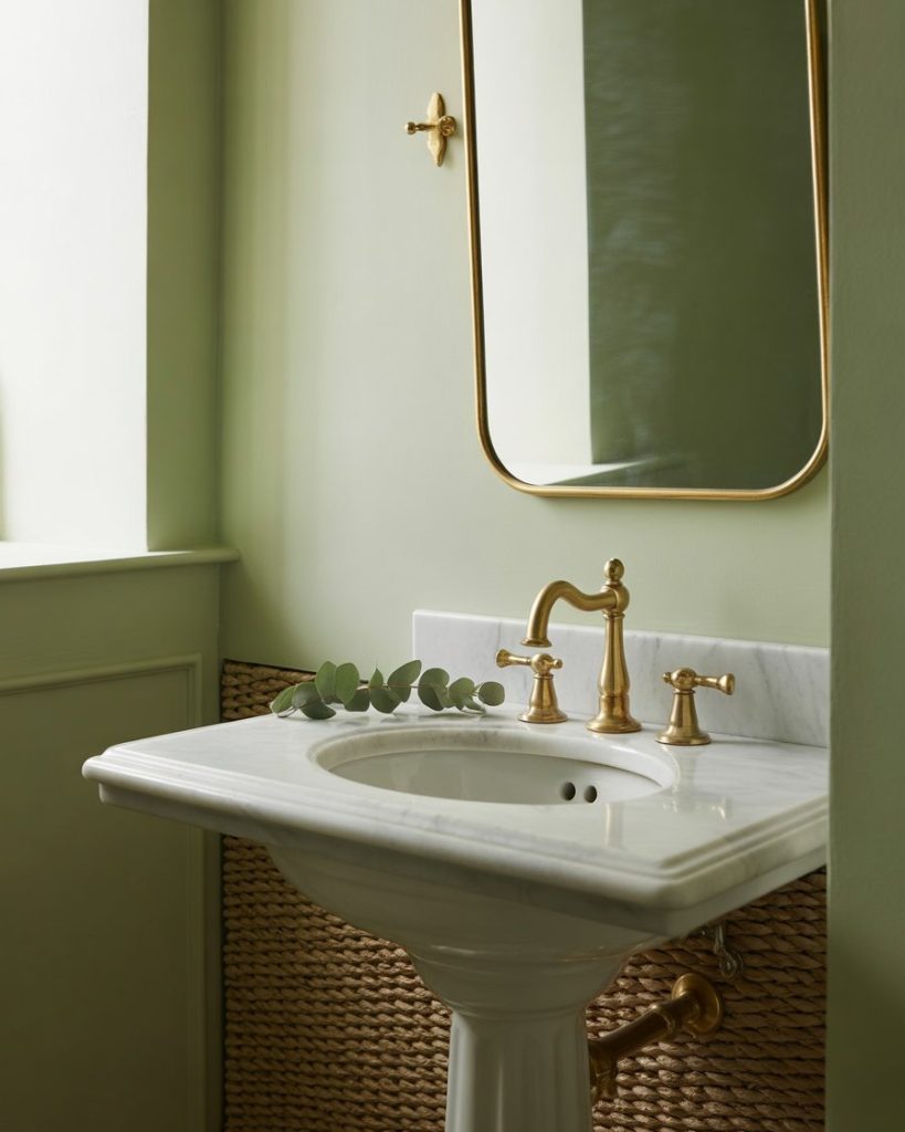 The soft green palette brings calm and freshness into a small powder room. Pair sage walls with brushed brass finishes and a nice slim pedestal sink to keep things in balance. Natural light keeps that organic vibe going; linen or bamboo décor brings in texture. This concept is a classic yet modern luxury trot along the pathway of Mother Nature’s lungs!