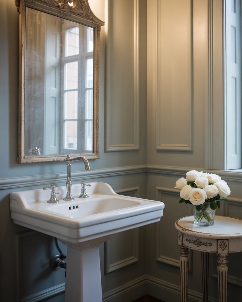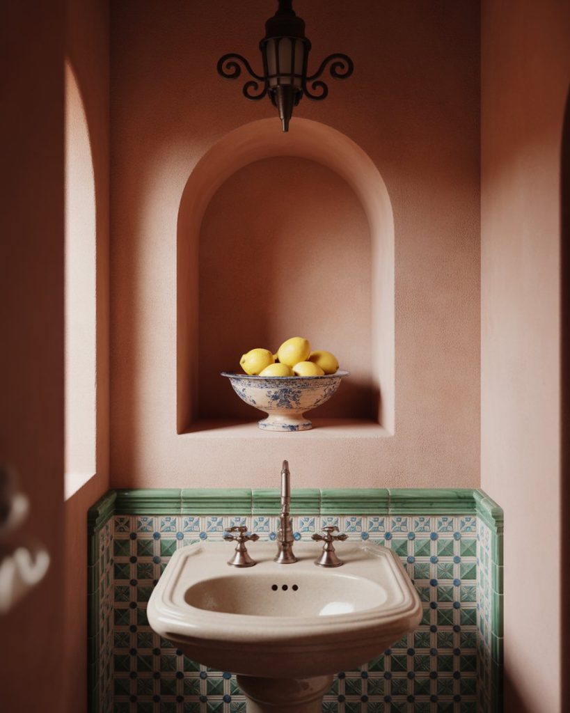 A Mediterranean powder room is a place of sunlit warmth and craftsmanship. Use terracotta walls, beautiful tiles with blue and green colors, and a curved pedestal sink amidst arched niches with wrought iron sconces or antique mirrors for texture and charm. This direction is suitable for character-embracing homes with a touch of classic European influence.