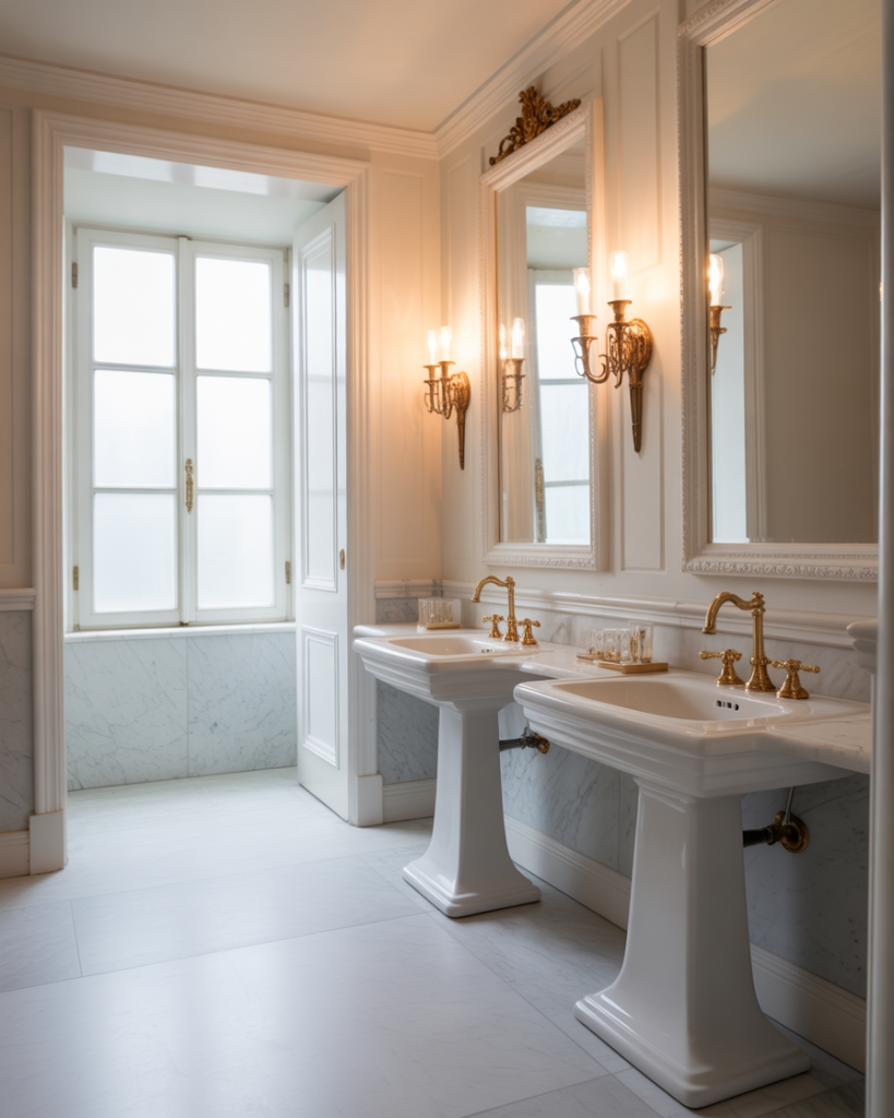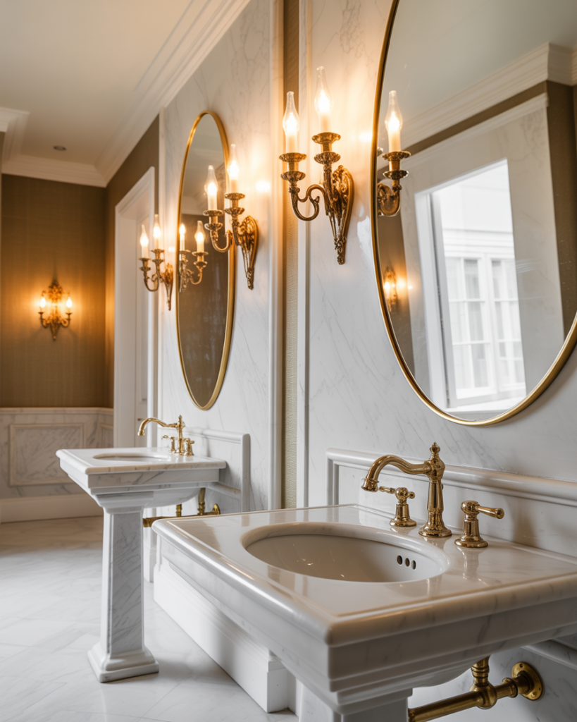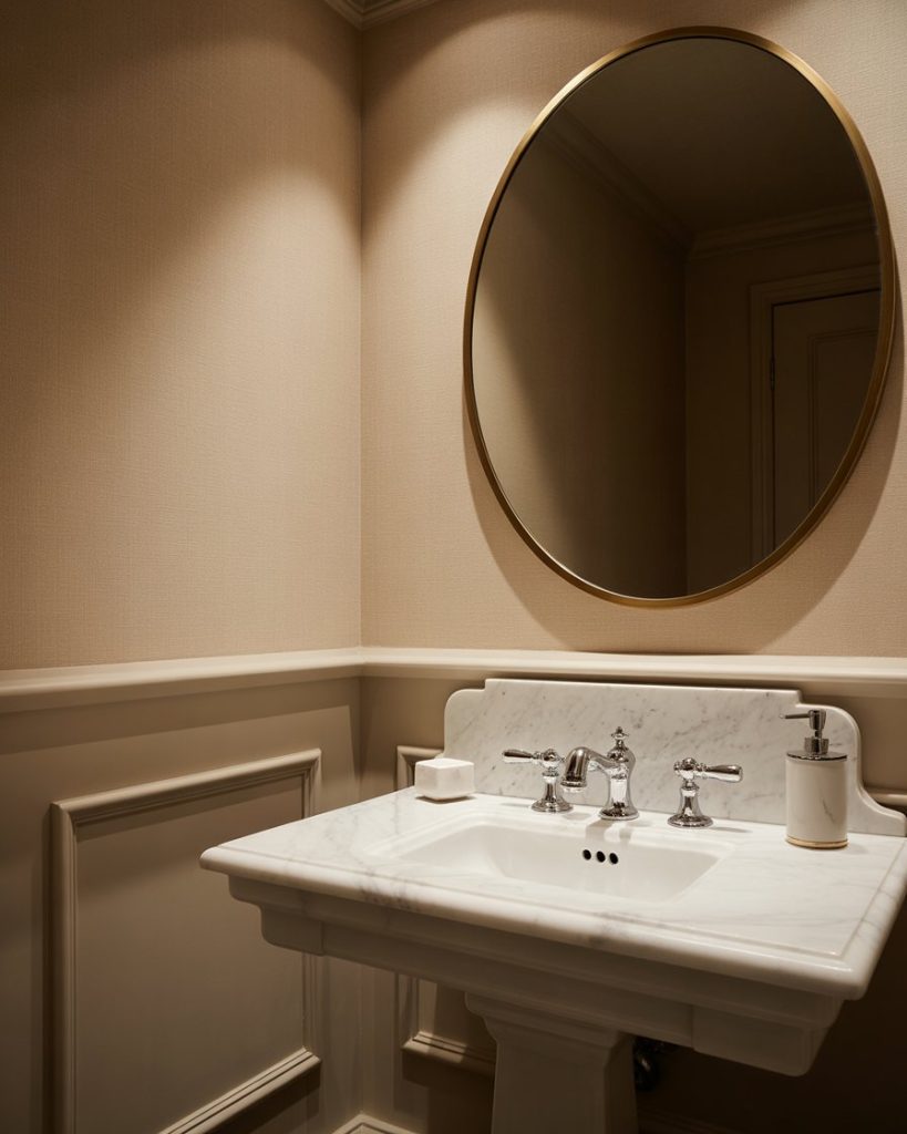 In a grand powder room, go all out with the materials—marble, glass, and gilded mirrors. Use the large space for dual pedestal sinks or a long floating vanity. Accent lighting, high ceilings, and bold textures will make a strong impression, reminiscent of a boutique hotel.