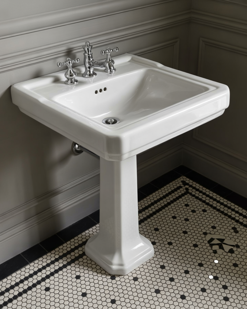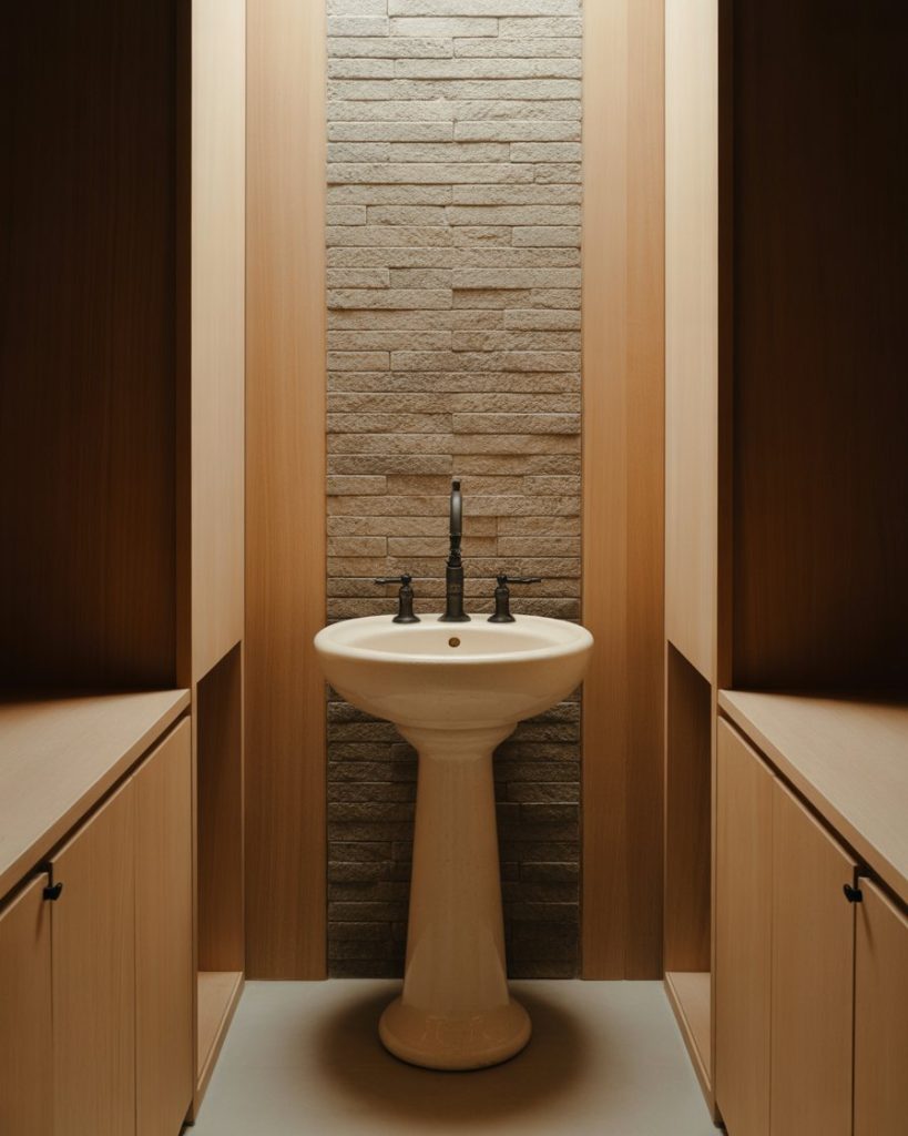 This elegant modern style champions simplicity and refinement. A monochrome palette resplendent in black and white with fixtures that engage clean lines and an open feeling thanks to the floating pedestal sink even if narrow. Subtle marble details or matte finishes provide restrained texture. It’s timeless yet fresh-and could be ideal for city apartments or any modern abode that leans into understated beauty.