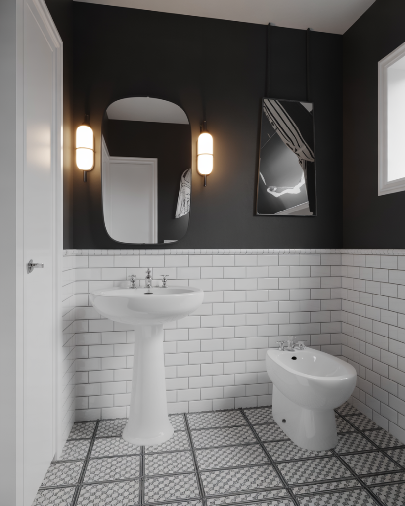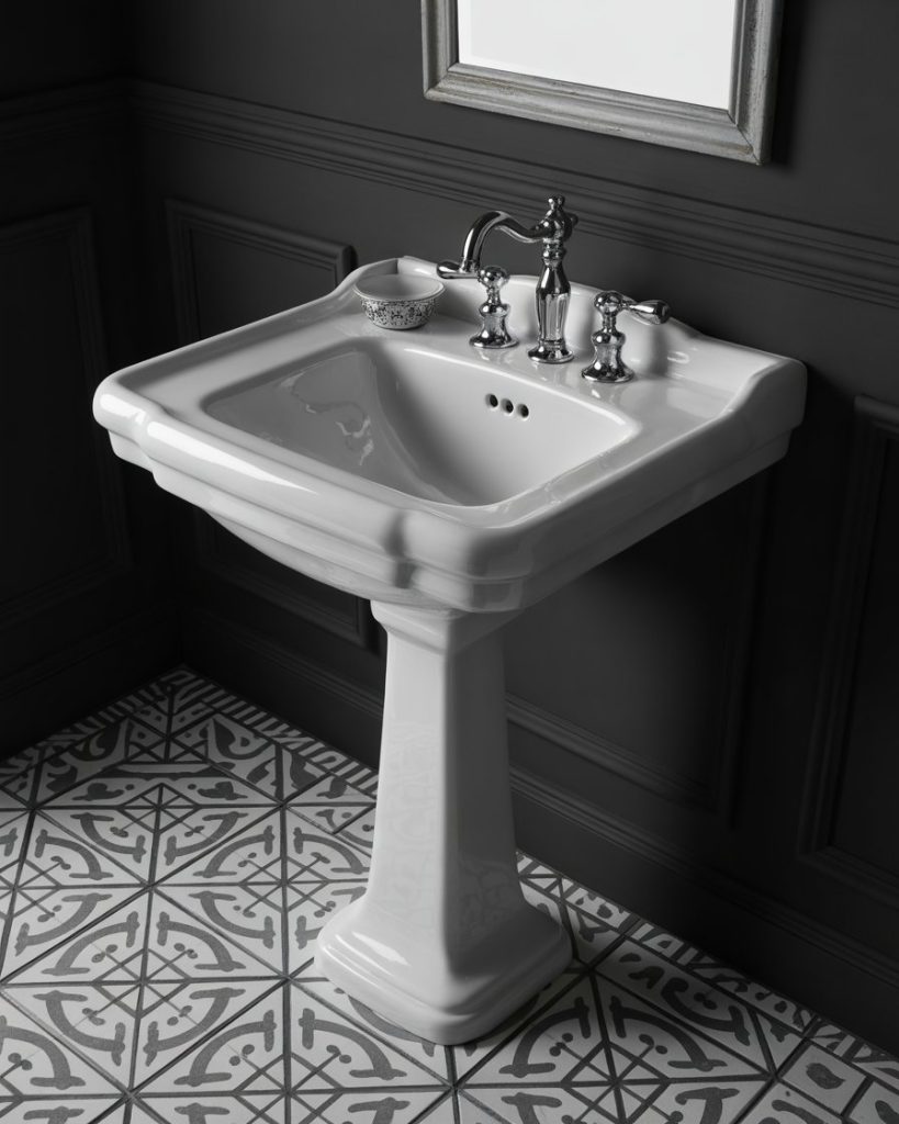 This is a design that never loses its appeal. A statement is created by mixing black wainscoting with white upper walls. The pedestal sink keeps the look crisp when paired with chrome fixtures and soft sconces. Add patterned floor tile to tie in everything with a touch of elegance.