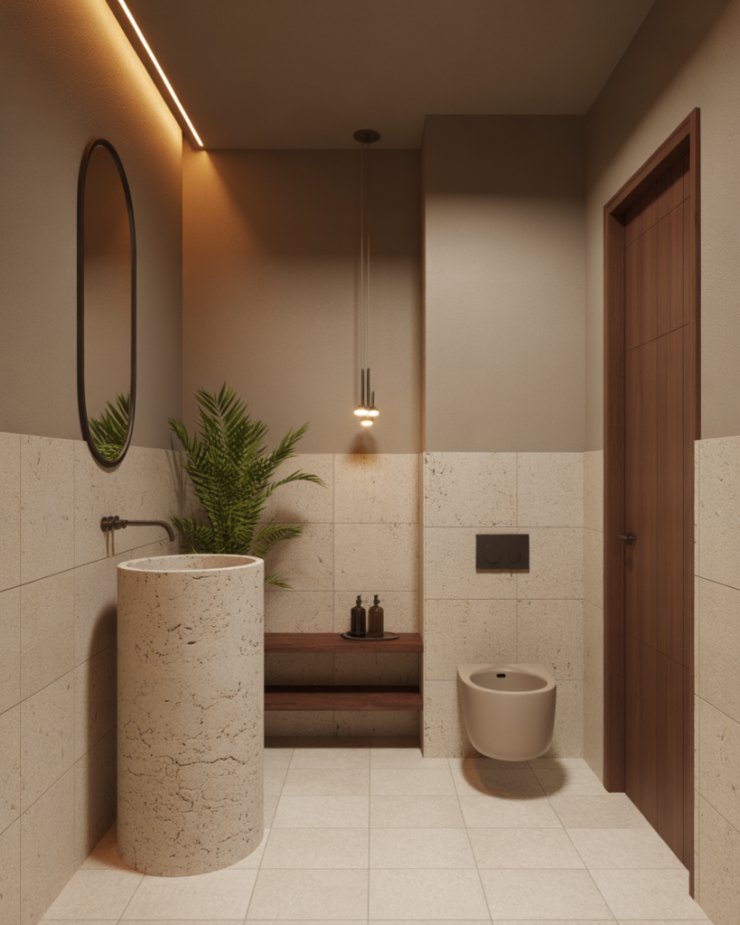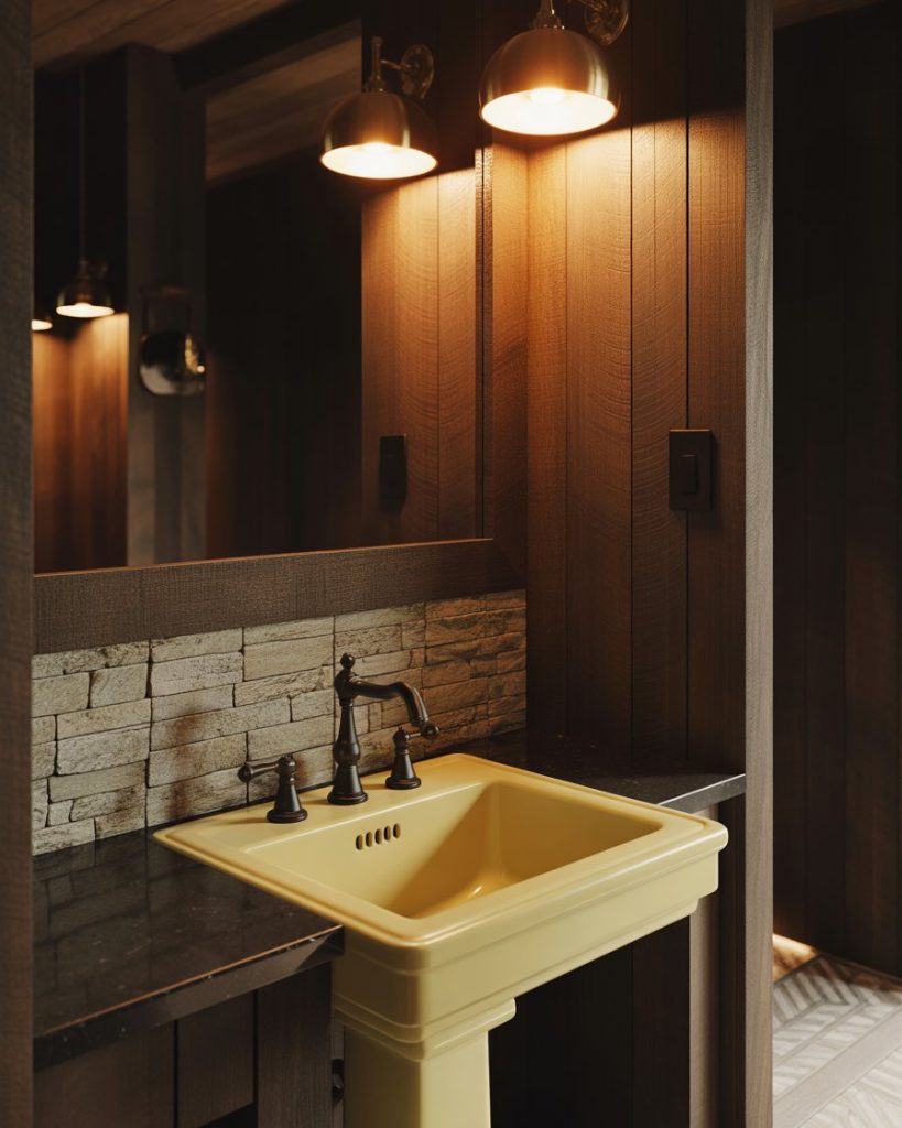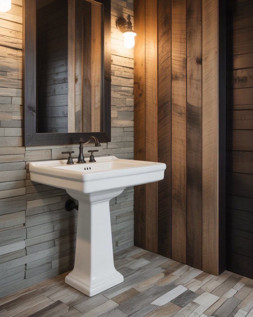 Leather rustic character with modern luxury for texture and contrast. Use reclaimed wood for warmth and black fixtures for structure. A stone backsplash behind a pedestal sink adds depth. Soft light reveals the grain and brings out the natural beauty of the materials.