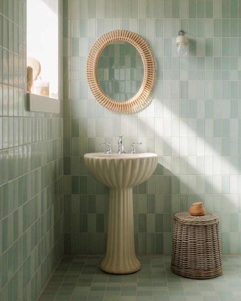 Merge coastal calm with organic modern textures. Combine driftwood, woven rattan, and pale blue or green walls for a natural, breezy atmosphere. A ceramic pedestal sink and simple white linen curtains finish the airy look.