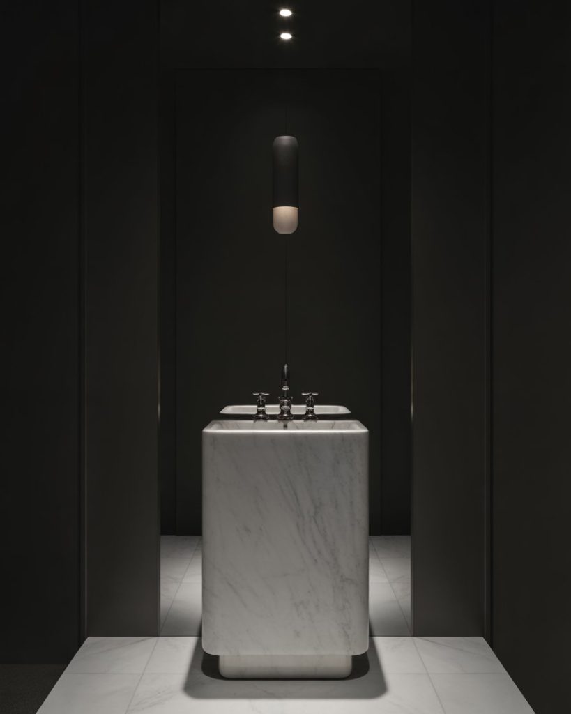 A moody and dark palette feels luxuriantly intimate. Deep green emerald, sapphire blue, or aubergine walls bring instant drama into a small room. A slim pedestal sink complemented by metallic accents for countering dramatism should do the trick, accompanied by wall sconces that emit a soft glow. This look is great for any enthusiast of atmospheric and penetrating design.