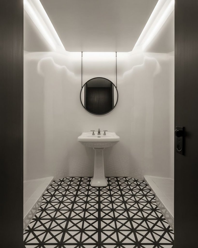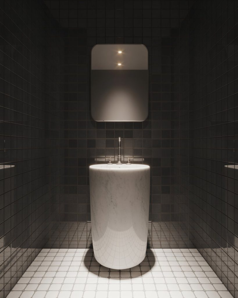 Bold black and white is a modern and timeless design. Geometric tiles, checkerboard floors, or walls in stark contrast create instant interest. The pedestal sink stands clear as a sculptural centerpiece. Top it up with slick lighting and a frameless mirror looking over the edge for maximum drama. Perfect for those who want to bring an unforgettable design moment to a tiny bathroom.