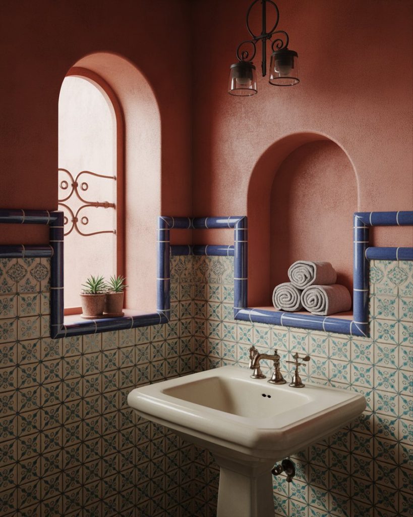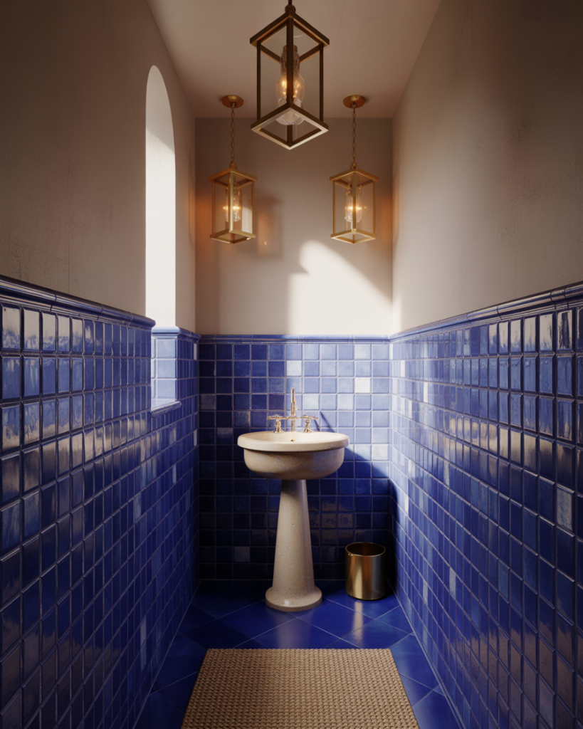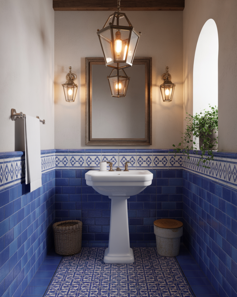 Inspired by coastal Europe, this Mediterranean design radiates warmth and depth. Rich cobalt blue or turquoise tiles, white plaster walls, and a rounded pedestal sink echo sunlit villas. Brass lanterns or mosaic mirrors add a touch of luxury and timeless charm.