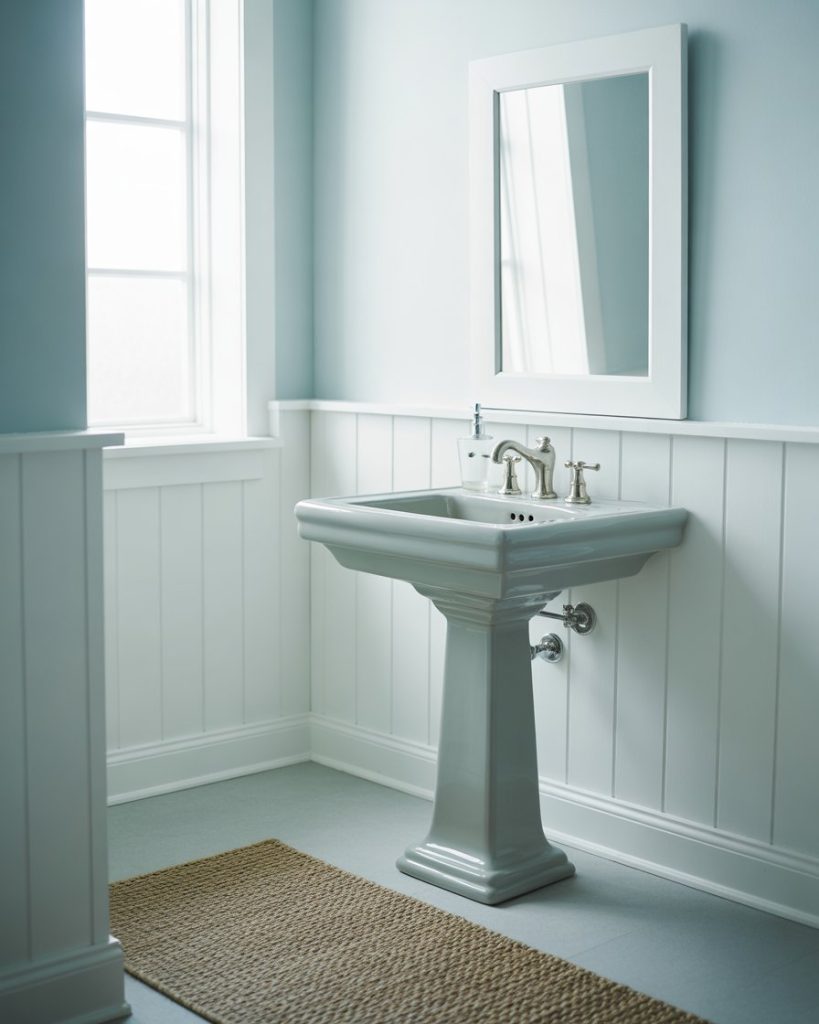 Bring coastal calm indoors with pale blues and whites with shiplap and soft natural textures. A pedestal sink coordinates well with woven accents or driftwood-framed mirrors. Fixtures in brushed nickel make a very faint sparkle of its own. Ideal for guest baths where one would want to imply a whiff of ocean air and light.