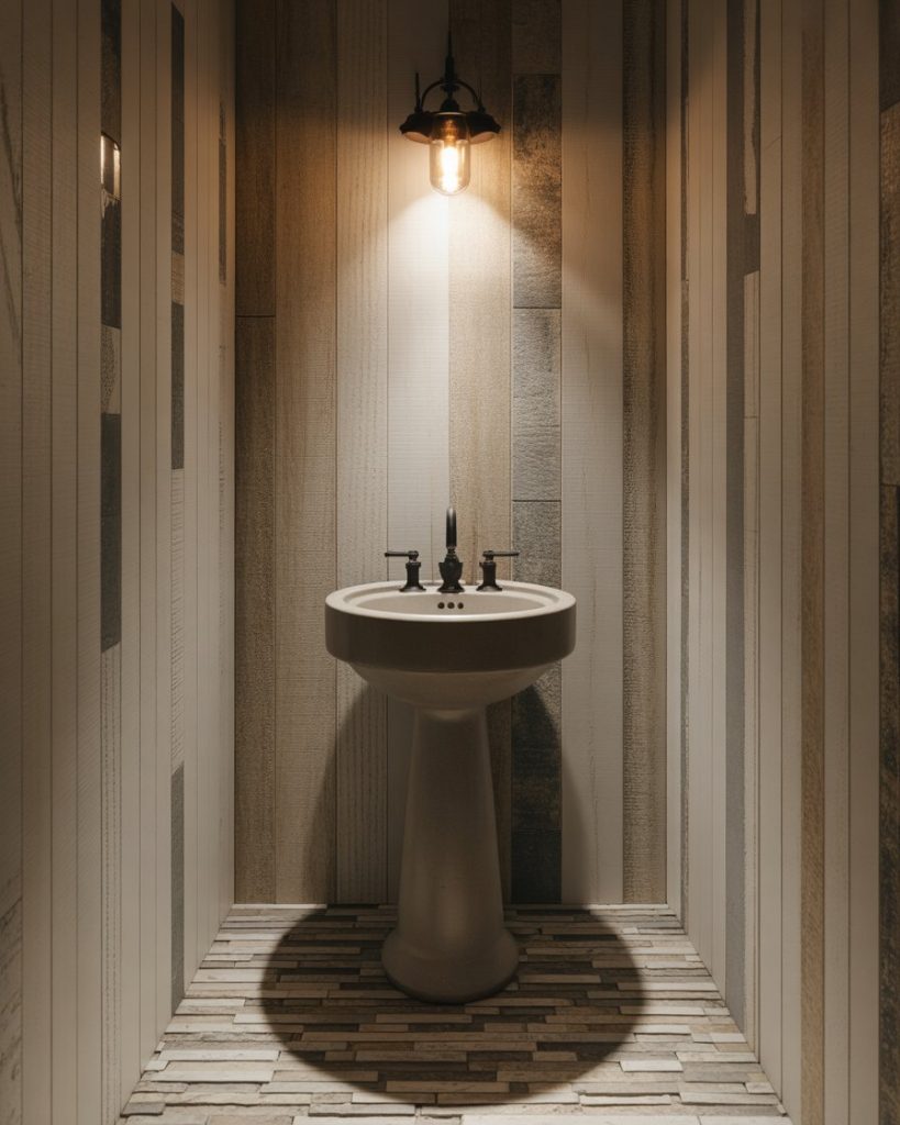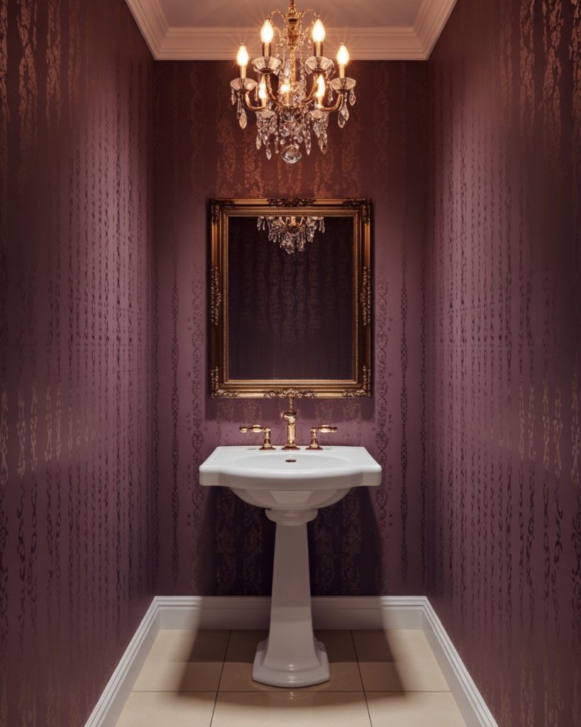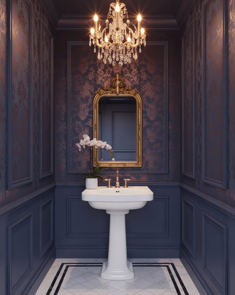 An elegant tiny space becomes a jewel box of luxury. Opt for shimmering wallpaper, gold hardware, and a petite pedestal sink with clean lines. Add sparkle thanks to a crystal sconce or small chandelier, while a deep tone such as navy or plum provides a moody backdrop. This combination illustrates that even the tiniest rooms can boast a luxurious charm.