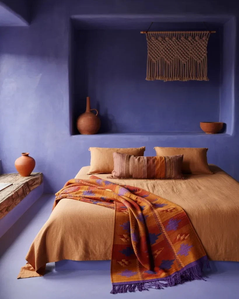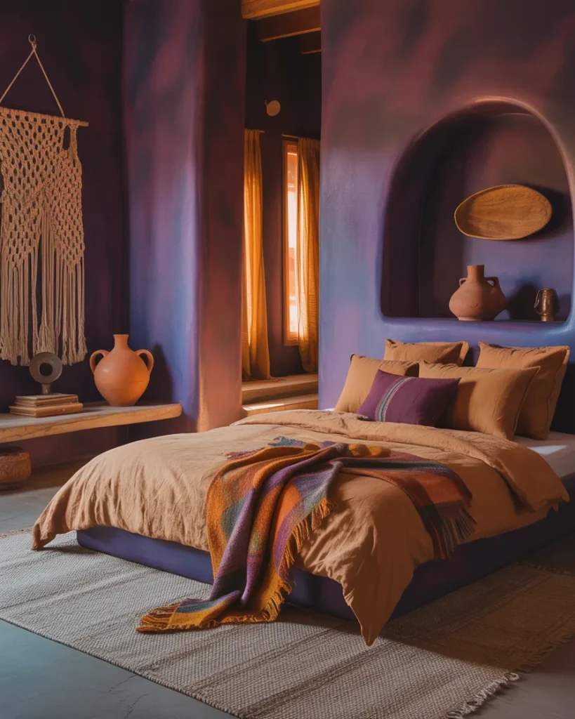 Few bedroom palettes feel as warm and grounded as orange and purple done right. This is a combination that draws from the earth—burnt sienna terracotta alongside violet and aubergine—and creates rooms that feel simultaneously bold and ancient, like they belong somewhere in the Mediterranean or the American Southwest. The aesthetic works best when both colors are slightly muted and warm-toned rather than bright and primary.