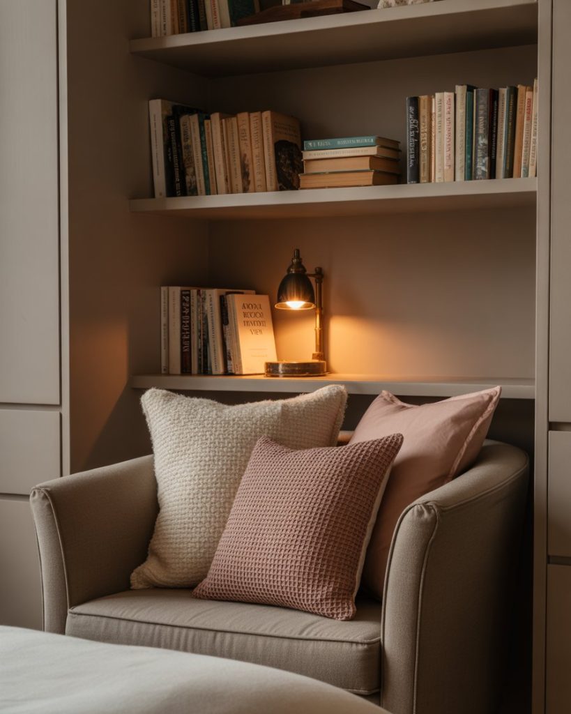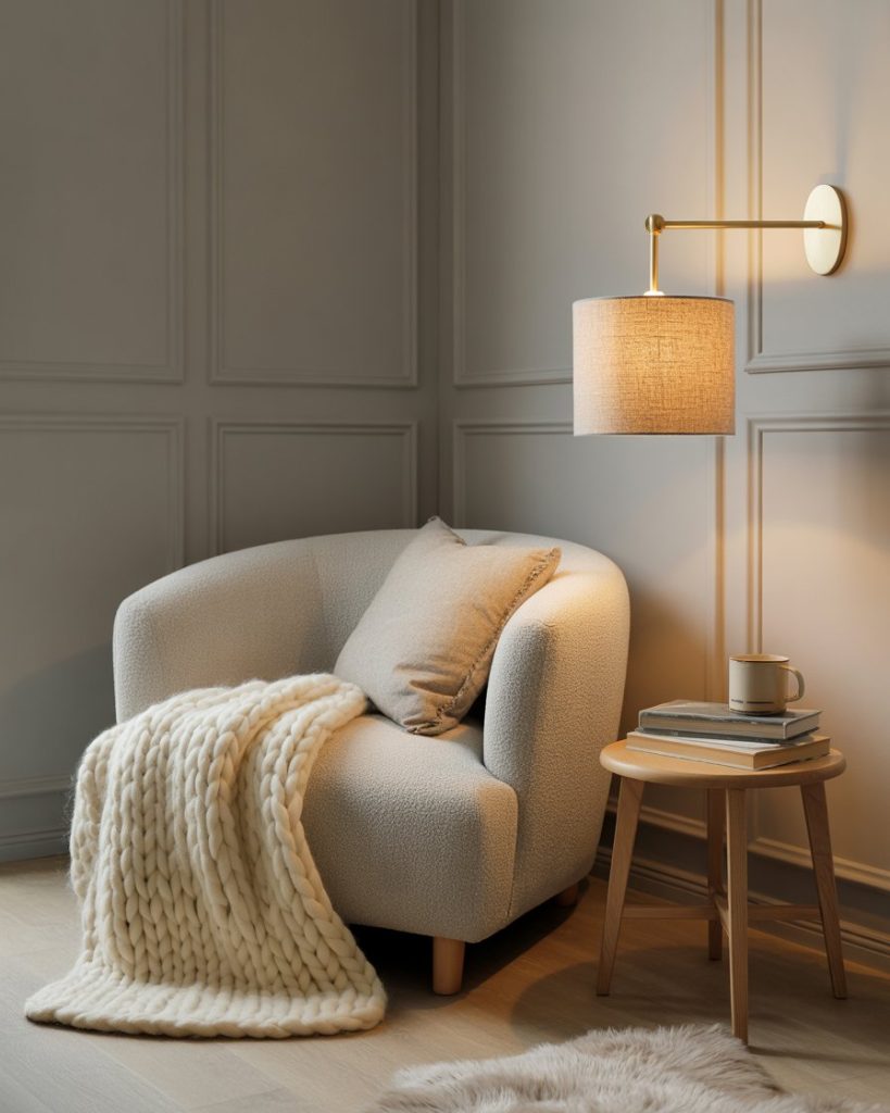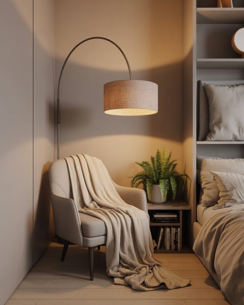 Scandinavian design remains influential, especially for small bedroom layouts. Clean lines, neutral tones, and functional storage create a serene reading space without clutter. A single armchair, throw blanket, and wall-mounted light fixture make this bedroom nook stylish yet practical. Ideal for adults who want simplicity with their nightly book routine.