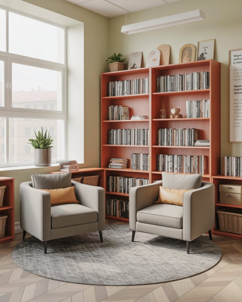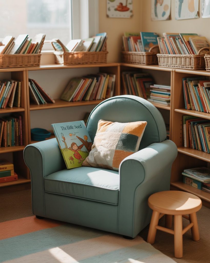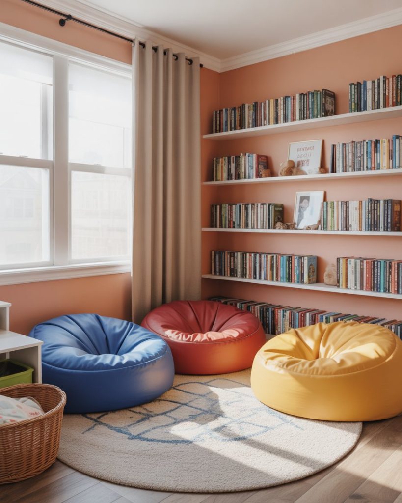 For families with children, incorporating playroom seating into a reading corner transforms a busy space into one of reflection. Soft beanbags, low chairs, and colorful cushions around shelves of book series make reading as appealing as play. This approach blends fun with function in both a preschool classroom or home playroom.
