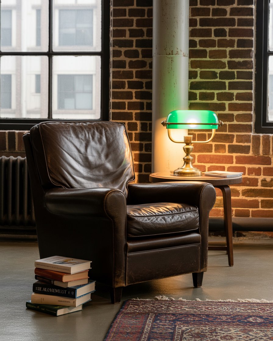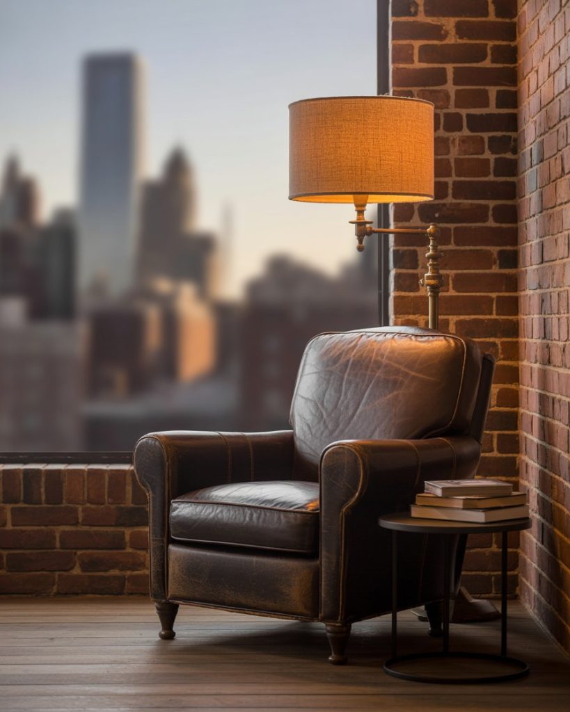 Industrial design fits perfectly into urban lofts, where exposed brick and metal fixtures set the mood. A large leather chair, vintage lamp, and stack of book favorites create contrast with raw materials. This corner works in adults living room or office setups, appealing to those who enjoy bold, character-rich design that still feels cozy.