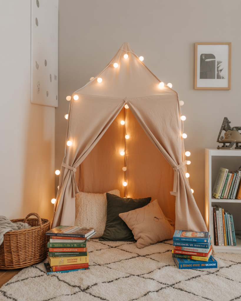 A small tent or canopy in a playroom or kindergarten corner becomes an instant invitation to read. Piled with pillows and fairy lights, it makes storytime magical. Many daycare centers use this style to foster imagination while giving kids a safe, cute, and private space to enjoy their favorite book collections.