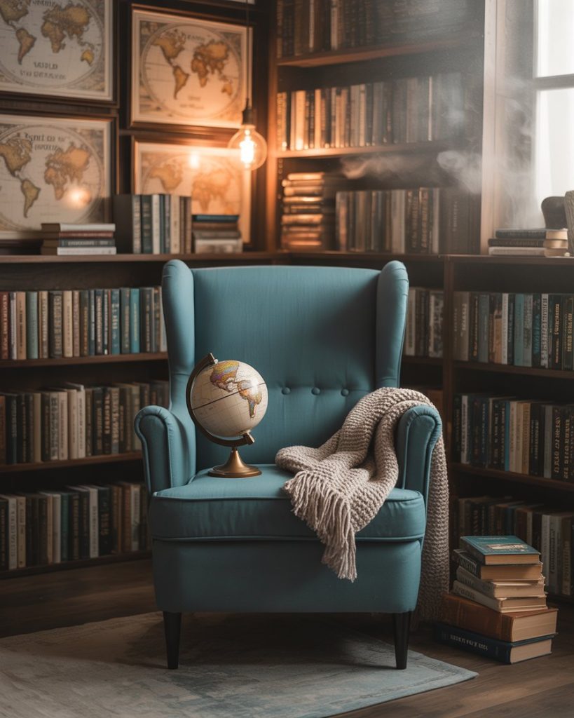 Bring adventure indoors with a travel theme. Vintage maps, globes, and shelves of travel book titles can inspire curiosity. This style works in classroom high school libraries or home living rooms. It’s a way to transport readers around the world without leaving their corner, making it engaging for students and adults alike.