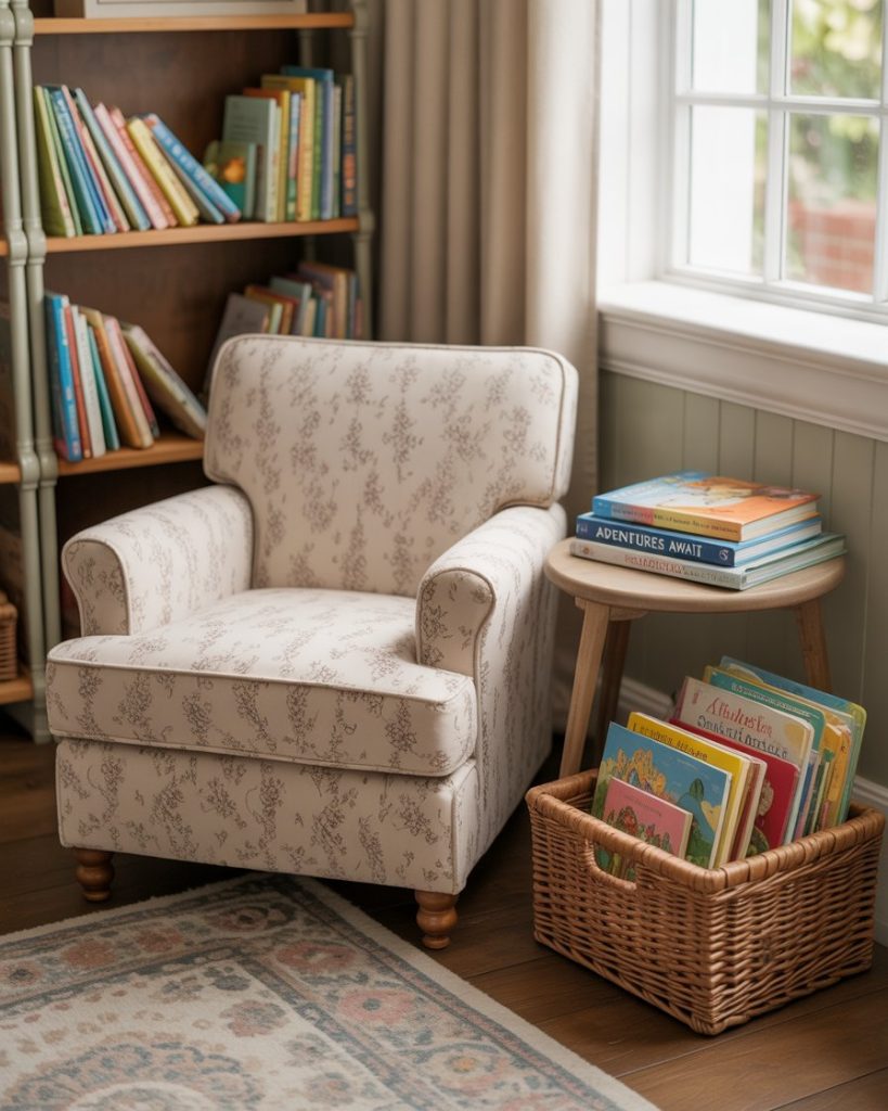 The English cottage style can also inspire children’s playroom seating. Small wooden chairs, floral fabrics, and rustic baskets filled with book treasures bring an old-world feel to a modern space. Combining comfort with whimsy, this design works well for preschool classroom reading circles or home settings.