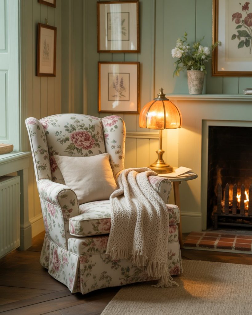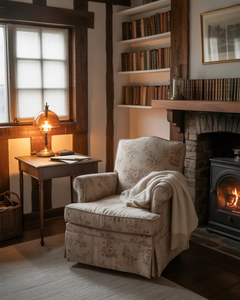 For those who love traditional warmth, a living room with English cottage influences makes an irresistible reading corner. Floral armchairs, vintage lamps, and handwoven blankets bring out that rustic, cozy aesthetic. It’s ideal for an adults living room where family and friends can gather, yet also escape into pages together. Designers like Rita Konig often recommend mixing antique pieces with comfort-first seating.