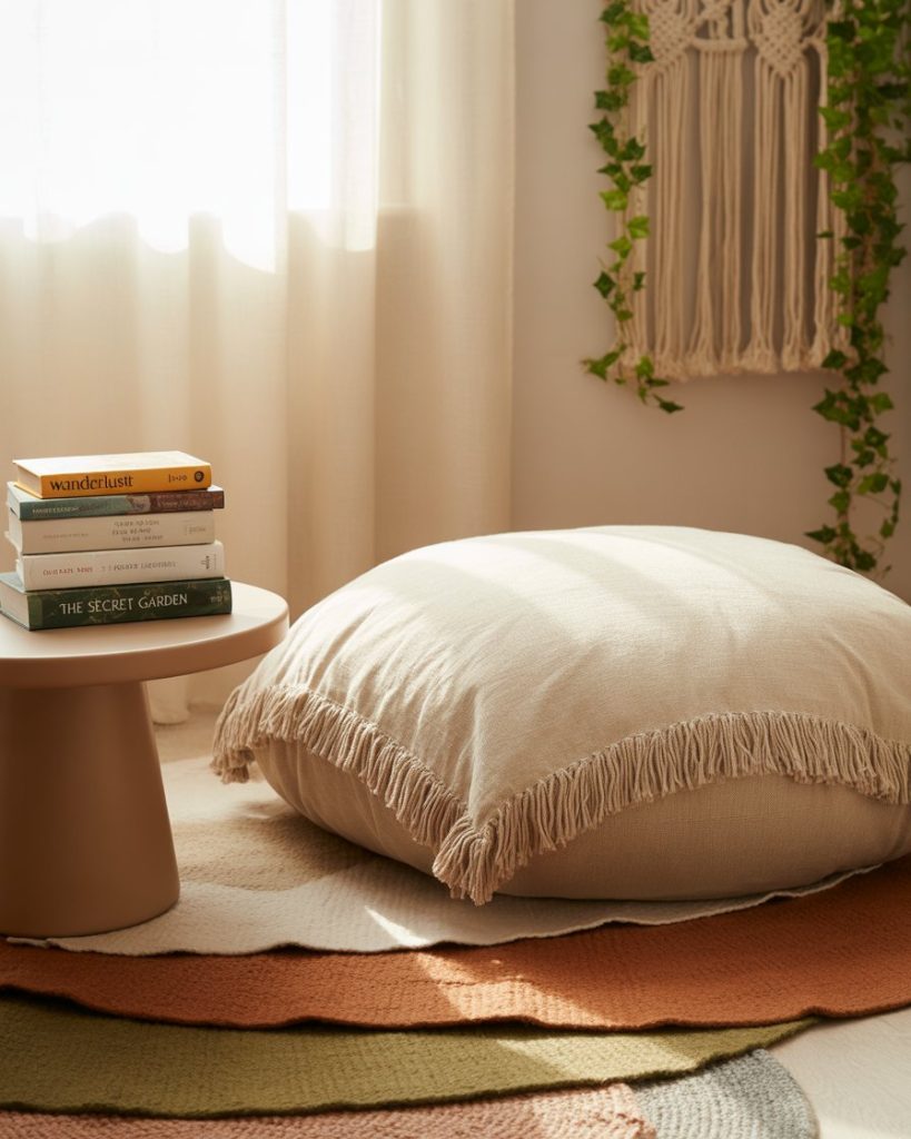 In 2026, adults boho styles are thriving—layered rugs, macramé wall hangings, and floor cushions transform an unused corner into a laid-back literary retreat. Add a low table for your favorite book and tea, and you have a tranquil place for mindful breaks. This aesthetic thrives in both living room and bedroom spaces. Influencers like Justina Blakeney of The Jungalow continue to inspire these designs.