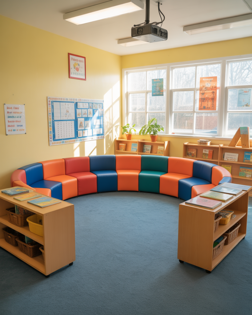 A classroom high school reading corner provides teens with quiet refuge from the bustle of school life. Comfortable armchairs, neutral décor, and shelves curated with age-appropriate book genres make it inviting. Teachers find that even older students appreciate a calm nook to recharge or explore novels independently, especially in English class settings.