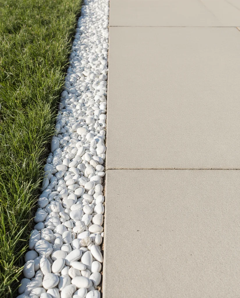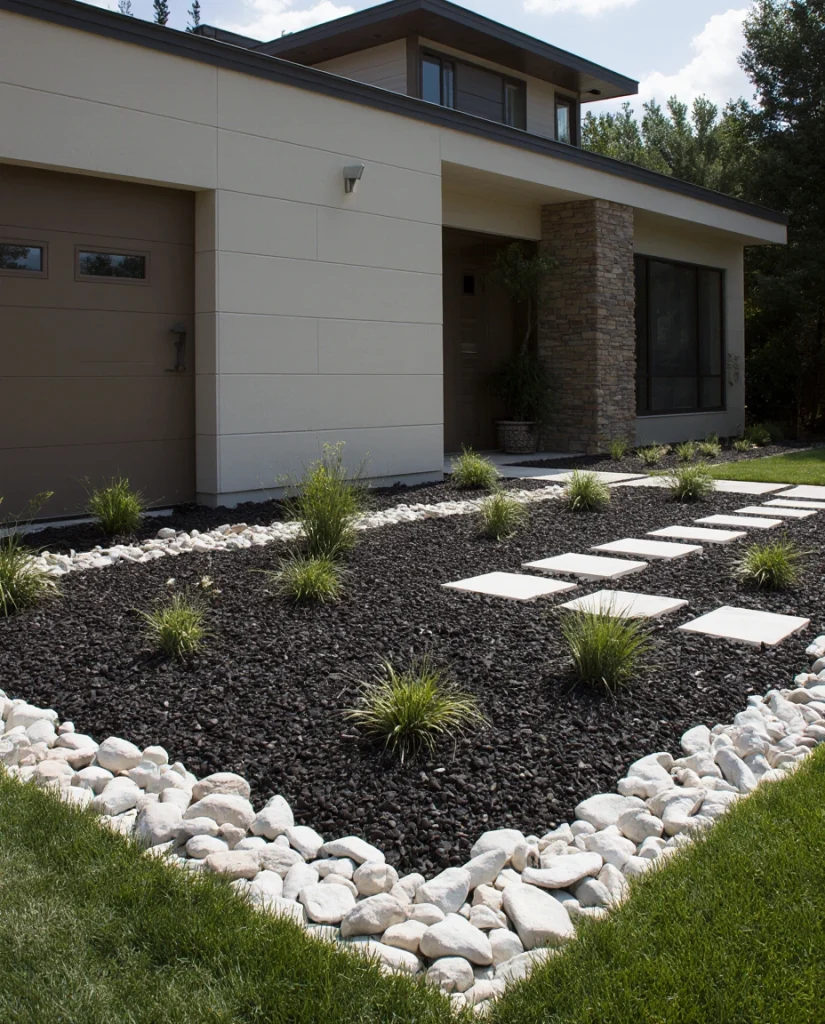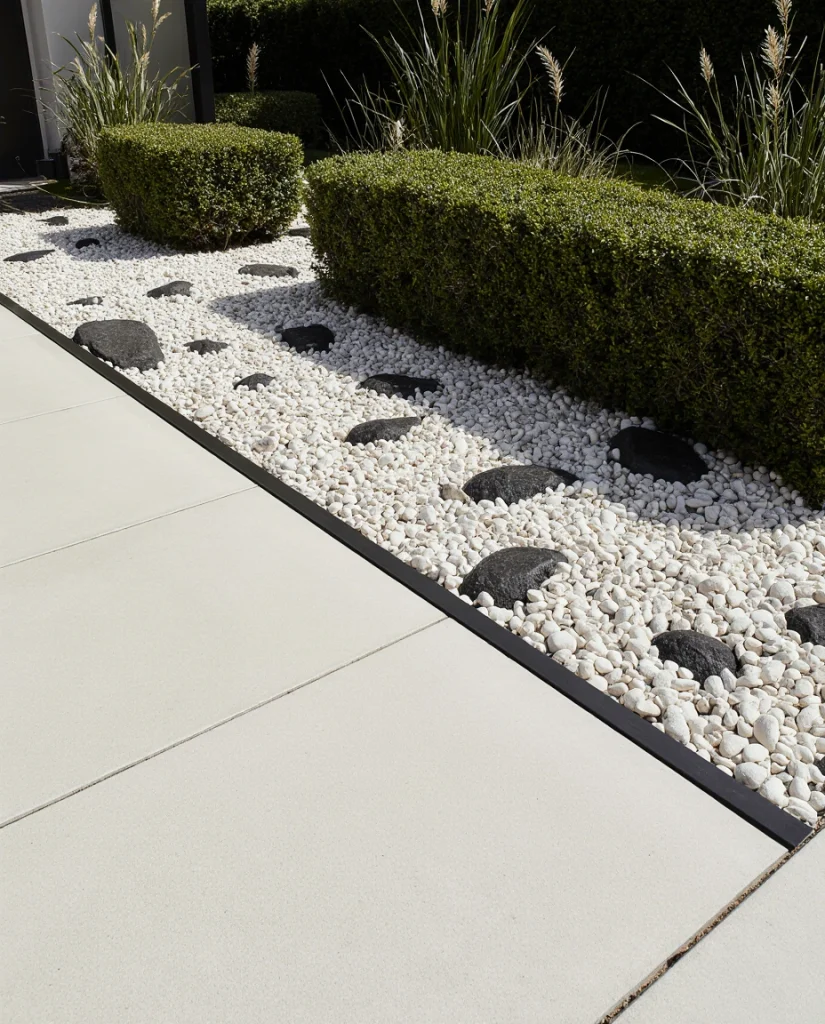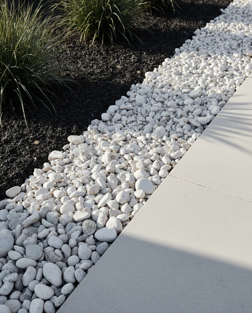 White river rock is ideal for a crisp front yard refresh, especially for DIY edging or combining with large river stones. A mix of white and black rocks can define the front entry and make smaller spaces appear more open. Many homeowners use it to highlight shrubs or pathways without heavy maintenance.