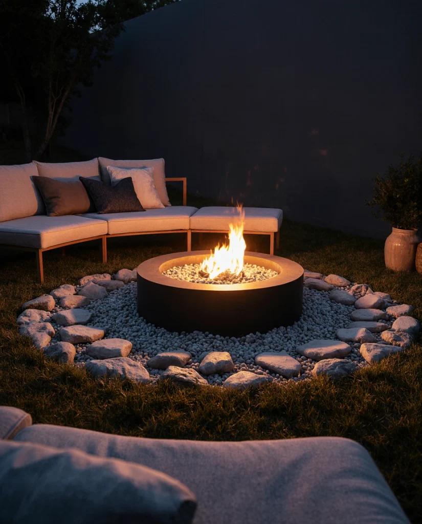 A simple rock ring around a fire pit embraces the lull of evening in moderate humidity and the heat of flames. Mixing random stones instills a casual accent in any outdoor area. It should match well with open backyard spaces, truly alive in enjoying the cooler seasons with whom it’s very backyard-friendly.