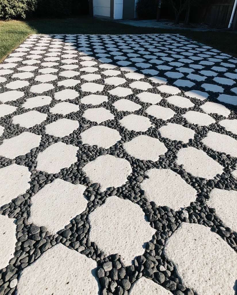 A white and black rock checker pattern gives an edgy feel to a small front lawn or patio. It is well-suited to contemporary homes, creating an opportunity to use some non-traditional landscape materials. A cool way to make bigger interest in small areas.
