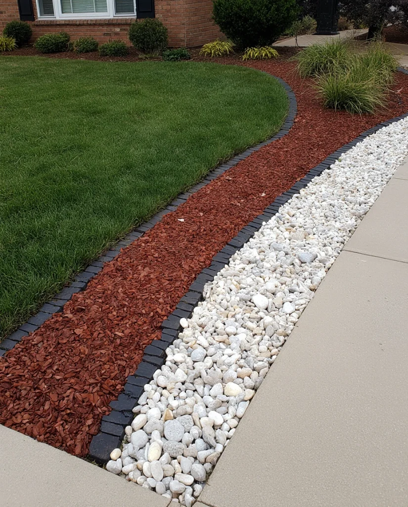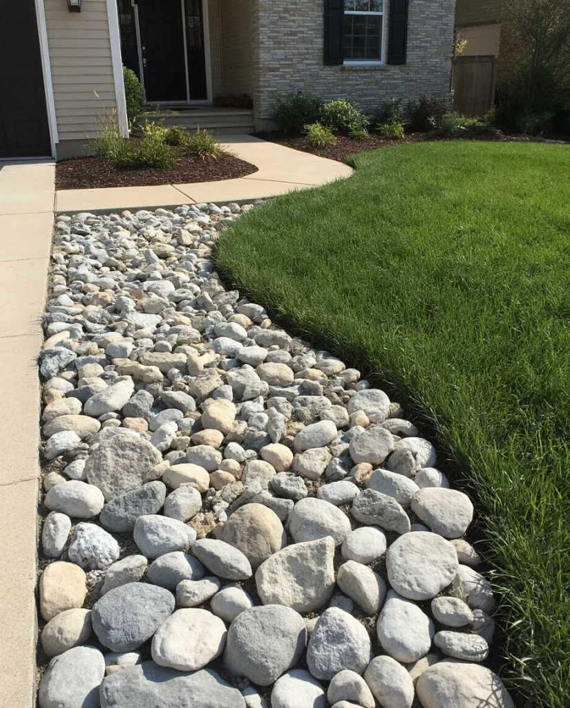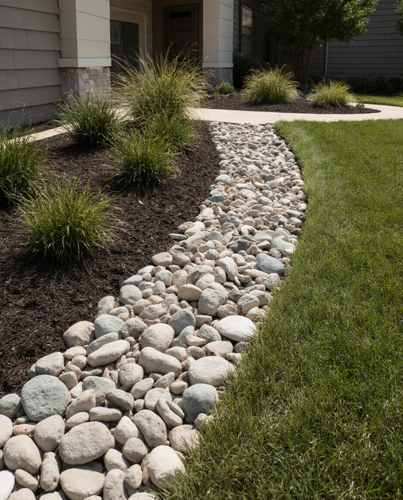 Using large river stones near the house or along downspouts helps manage water naturally while still looking stylish. This approach works well in the front yard for homeowners wanting both beauty and practicality. The rounded stones blend seamlessly with surrounding beds and offer long-term durability.