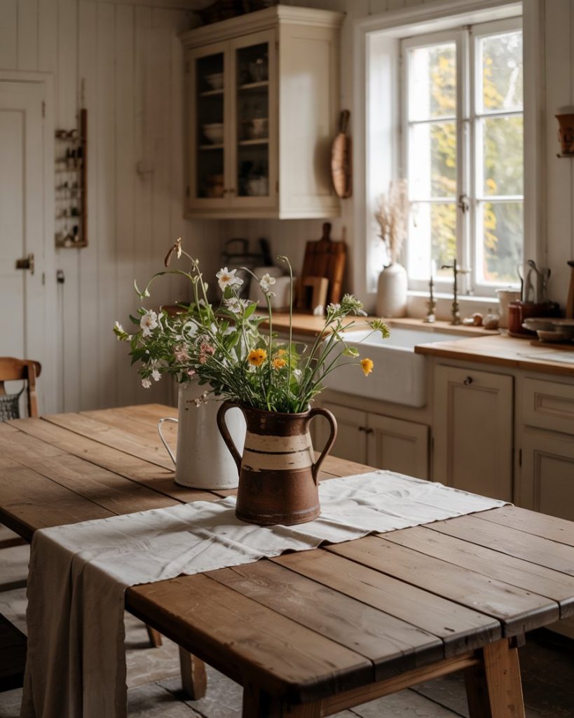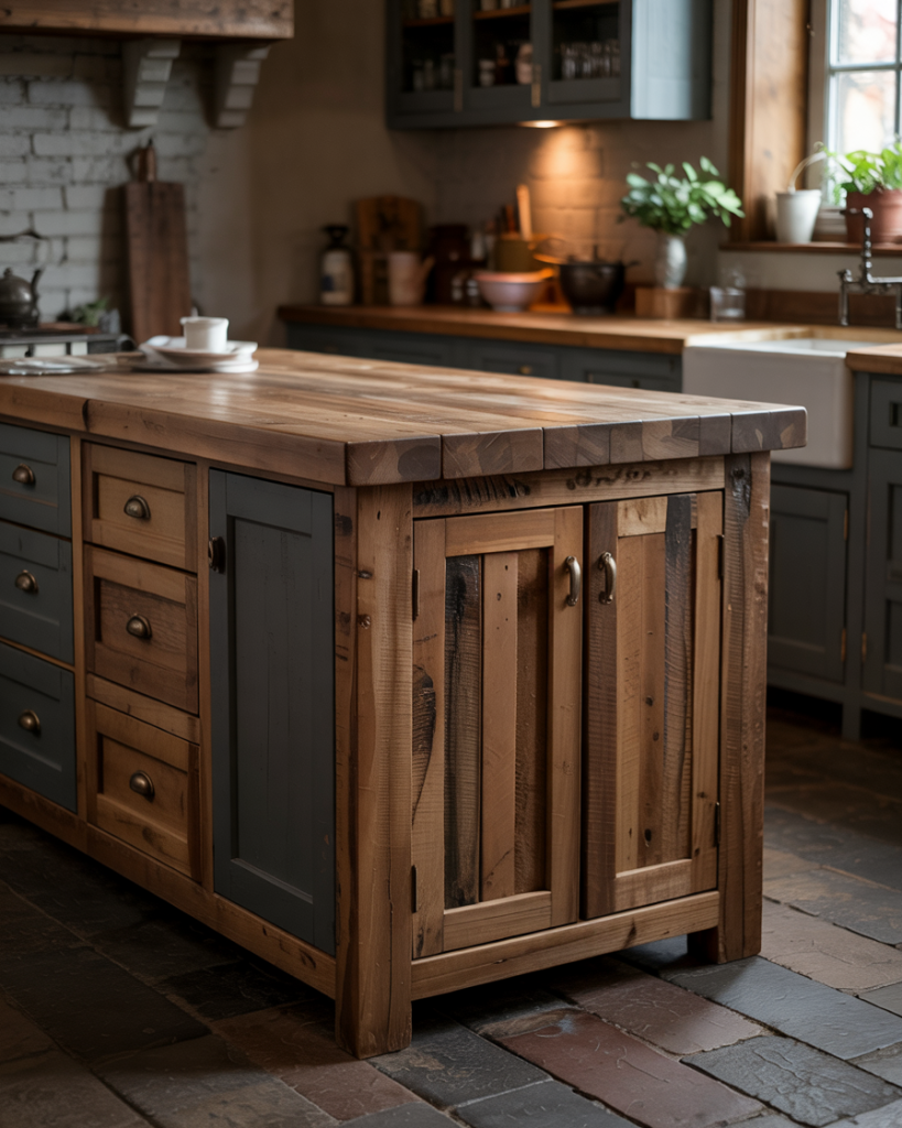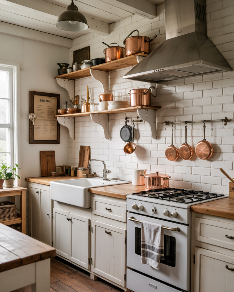 Using reclaimed wood instantly adds vintage soul to a rustic kitchen. Old barn planks, salvaged beams, or reused floorboards bring texture that can’t be faked. Pair them with black iron brackets or white tile backsplashes for contrast. This approach is eco-friendly and works even on a budget, since second-life materials often cost less than new ones.