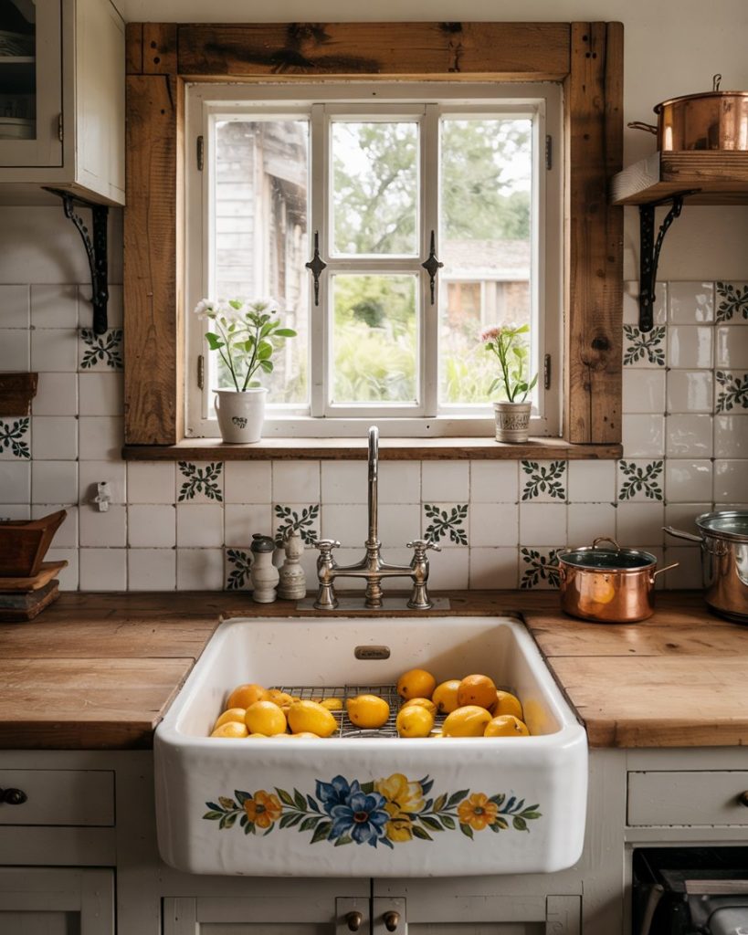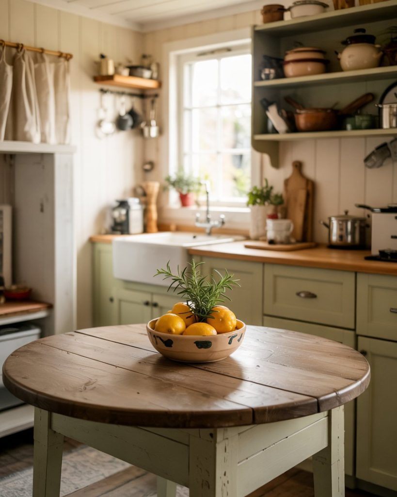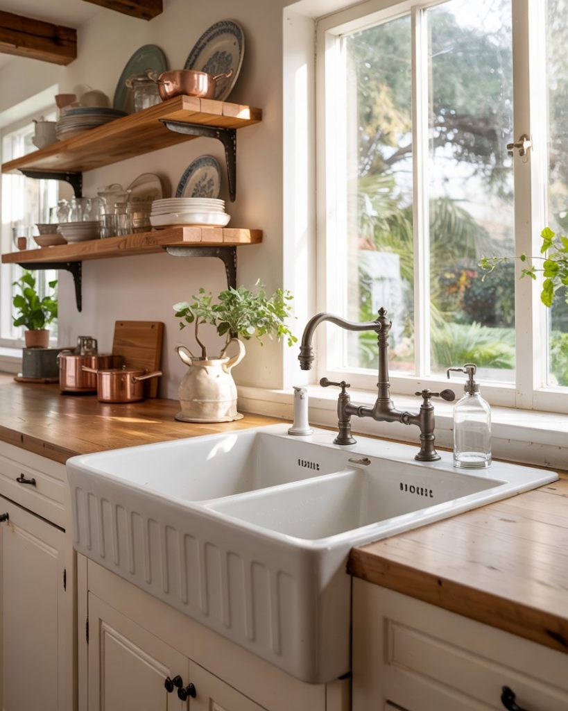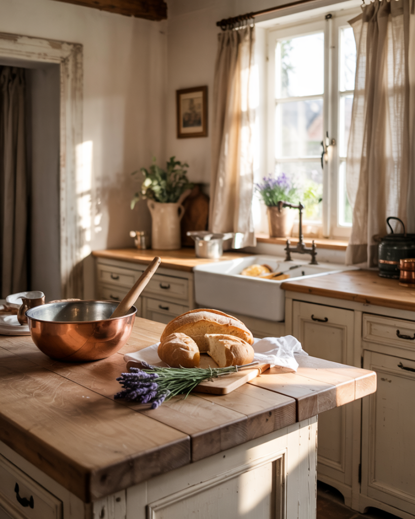 Inspired by farmhouse French country interior design, this idea brings the charm of Provence into your kitchen. Distressed vintage French country cabinets, soft beige walls, and delicate iron hardware create an inviting space. Pair with linen curtains and open shelves for that refined French authenticity. It’s elegance wrapped in rustic warmth.