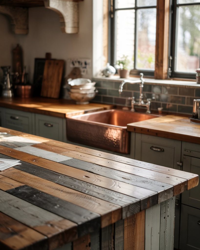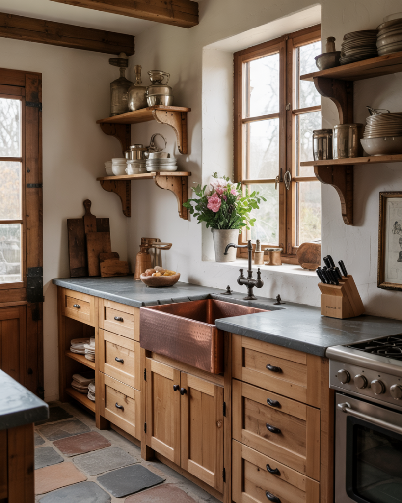 Natural stone counters paired with hammered copper sinks create a French-inspired rustic luxury. The mix of cool and warm tones feels both cozy and refined. Stone grounds the room, while copper adds a glow that deepens with time. Designers love this pairing in farmhouse and country homes where patina is embraced, not polished away.