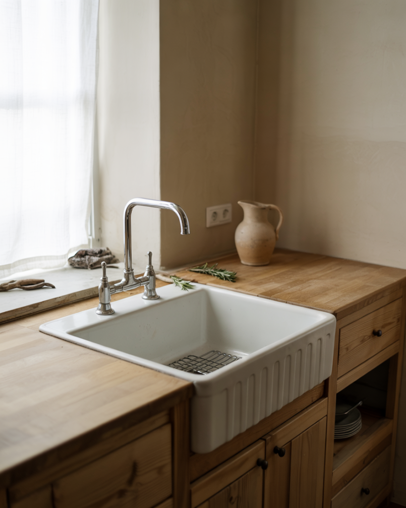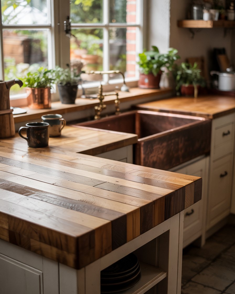 Butcher block counters embody simple rustic living. Whether oiled maple or reclaimed oak, the surface ages beautifully over time. They match both farmhouse and modern kitchens, add warmth instantly, and can be refinished instead of replaced. Perfect for small spaces where every surface must work hard.