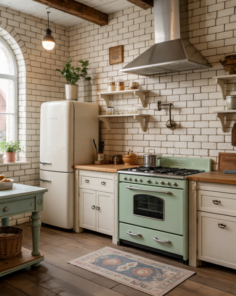 Instead of shiny new stainless steel, many 2026 renovators are turning to vintage or retro-style appliances. Cream enamel fridges, bronze-trimmed ovens, or green pastel stoves fit perfectly into farmhouse and French rustic spaces. They add character while still offering modern tech underneath.