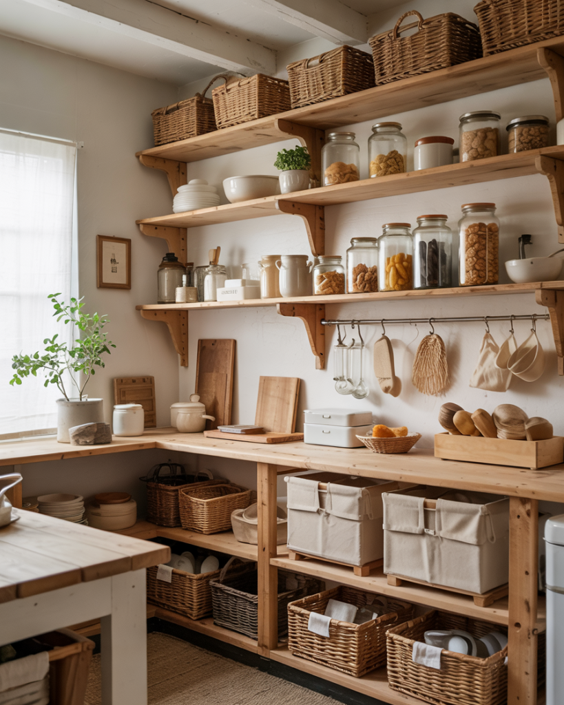 Instead of hiding food in cabinets, open pantry walls let jars, grains, and baskets become part of the décor. The look feels simple, honest, and very farmhouse. Use wicker baskets, glass jars, and beige linen bags for a soft, earthy vibe. Works especially well in small spaces that need visual lightness.