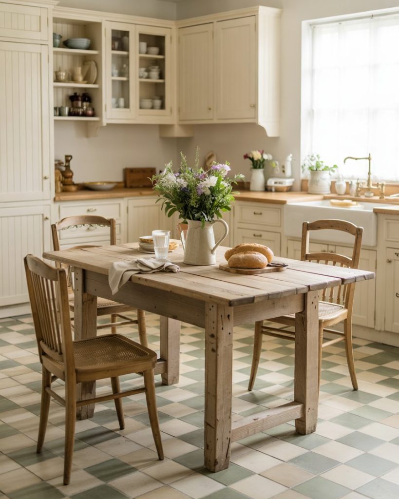 Black-and-white or green-and-cream checkerboard floors are trending again thanks to their nostalgic vintage appeal. They work beautifully in French country kitchens or cozy cottages. The pattern adds movement without feeling busy and looks great with white cabinets or reclaimed wood islands.